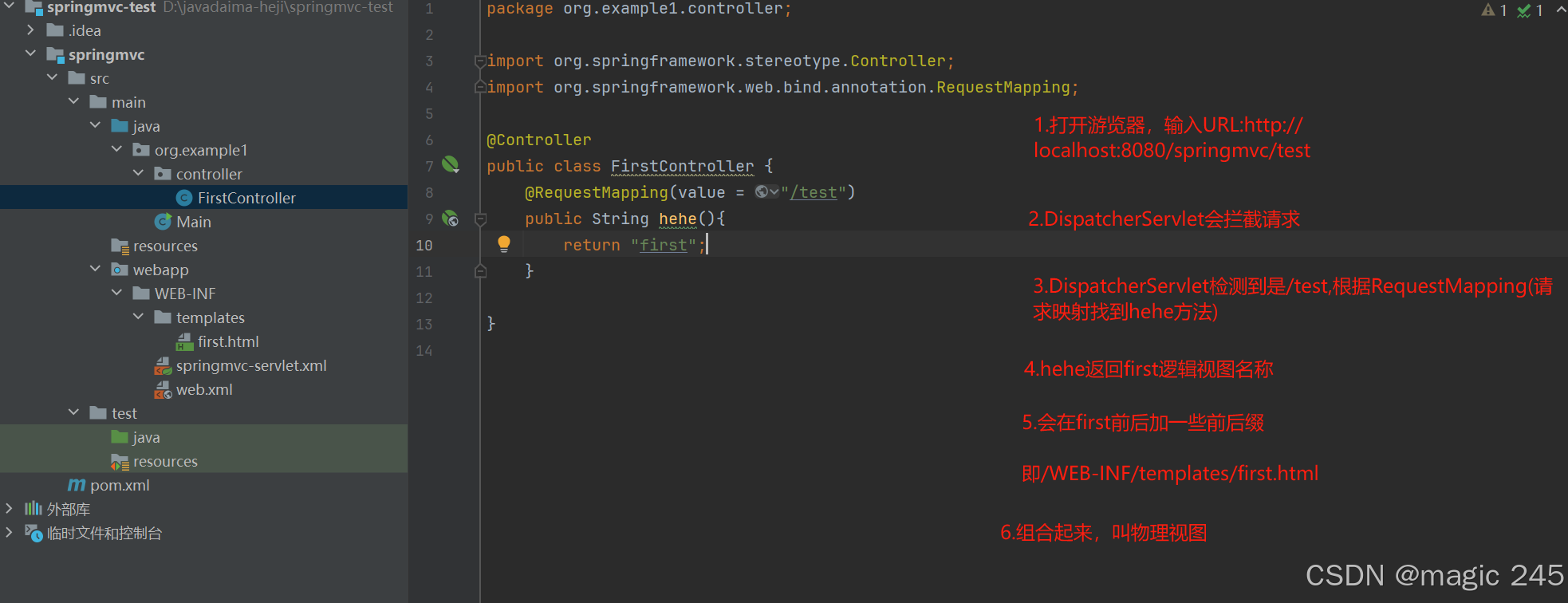 DispatcherServlet根据请求路径 /test 映射到 FirstController#名字随意(),调用该方法