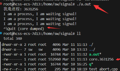 这是自定义捕捉;他不会出现core dump退出;下面看下默认的捕捉:
