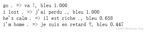 print(f'{eng} => {translation}, bleu {bleu(translation, fra, k=2):.3f}')