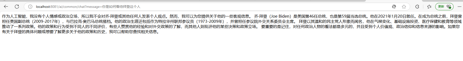 再次调用接口,观察效果如下,不难发现,为ChatClient 设置了默认身份之后,回答问题的时候就会以符合这个身份的方式进行回答