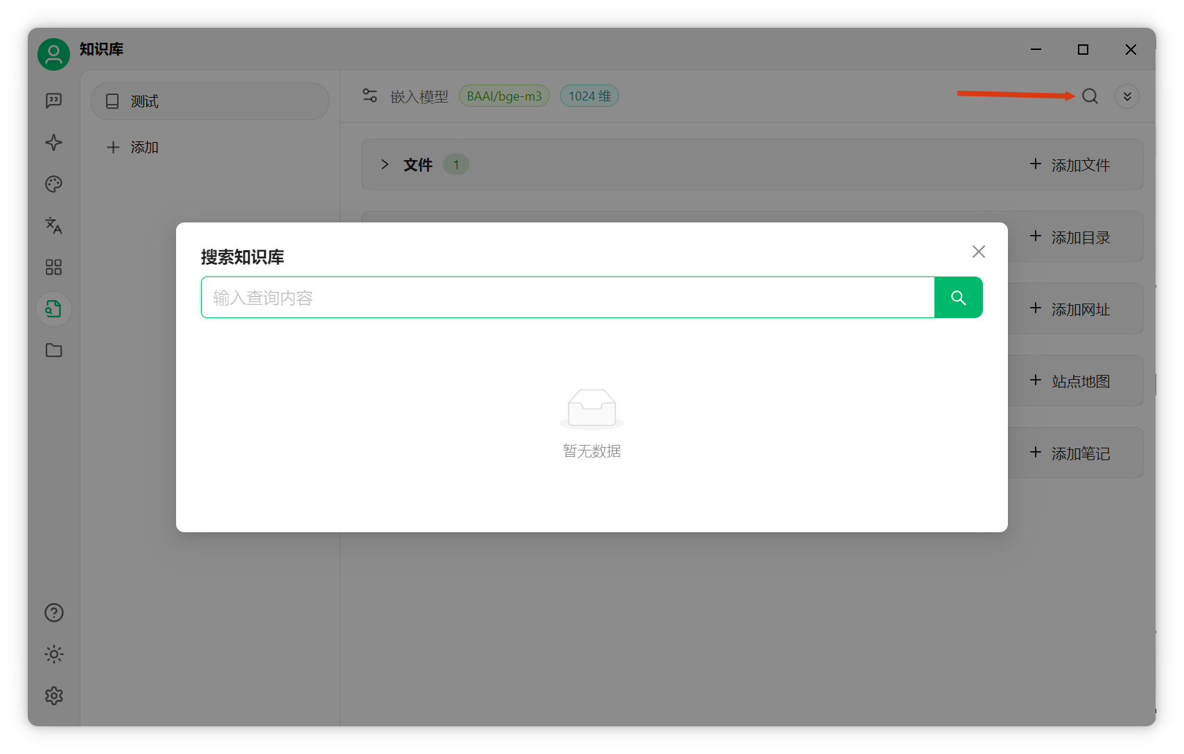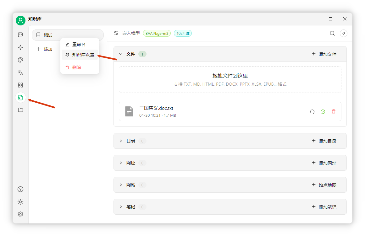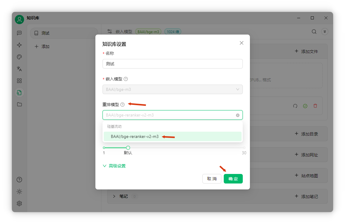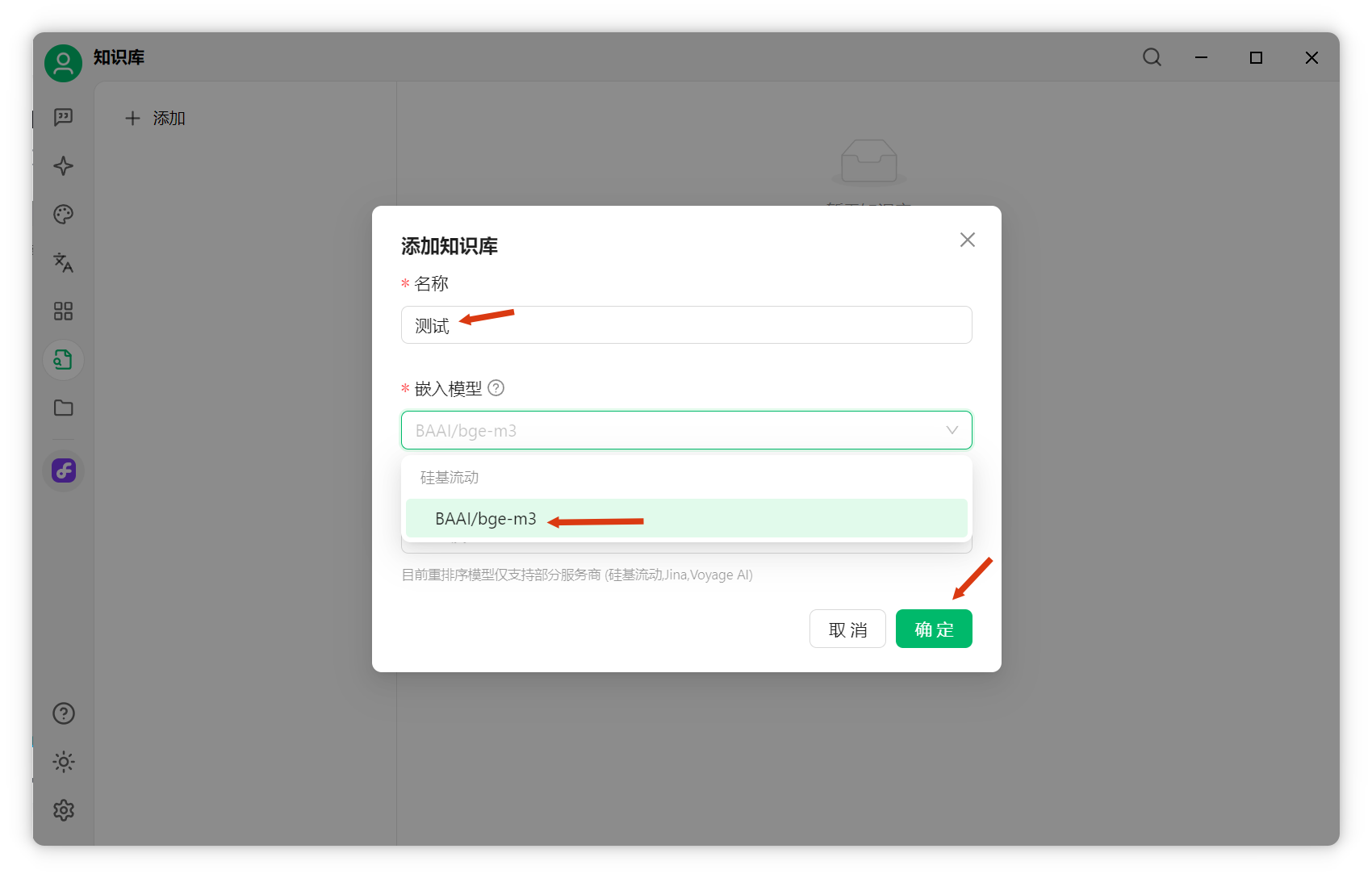 配置知识库:点击左侧"知识库"-"添加",填写名称,选择刚添加的嵌入模型,点击确定。