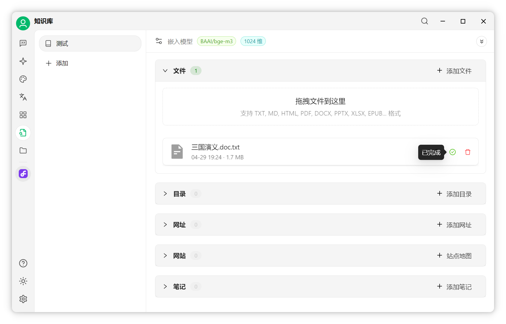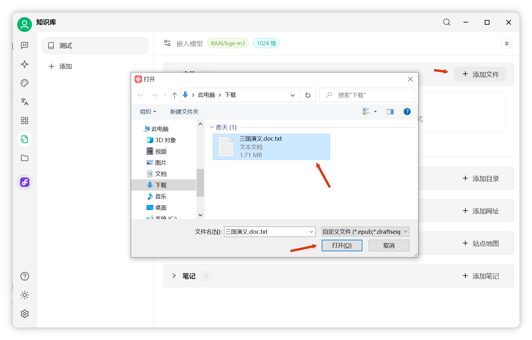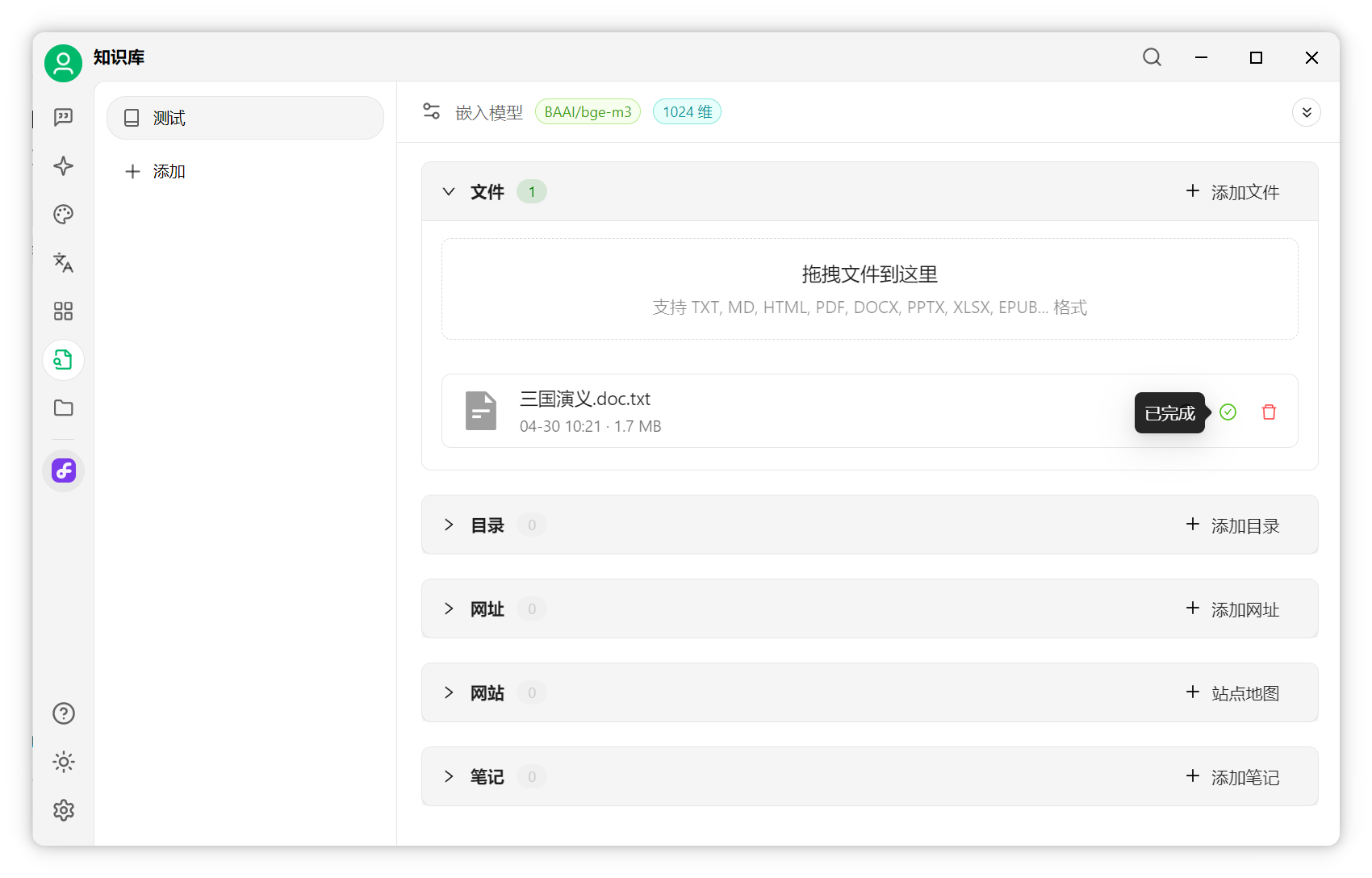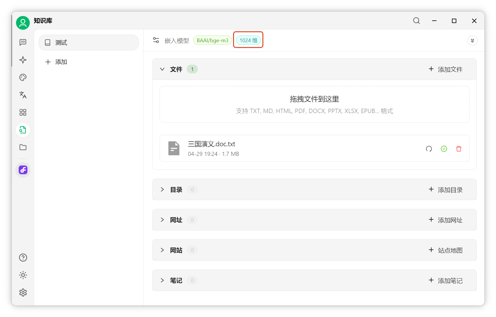 配置知识库:点击左侧"知识库"-"添加",填写名称,选择刚添加的嵌入模型,点击确定。