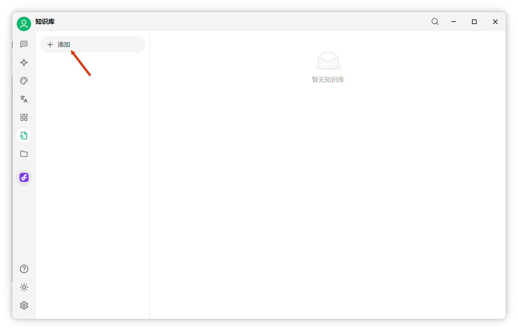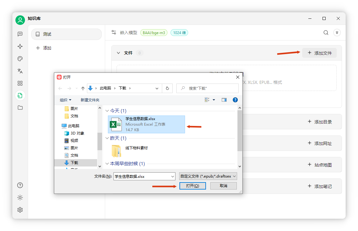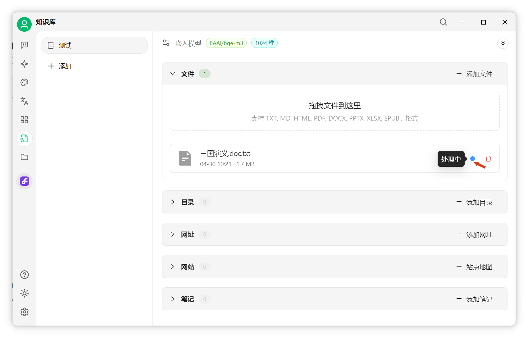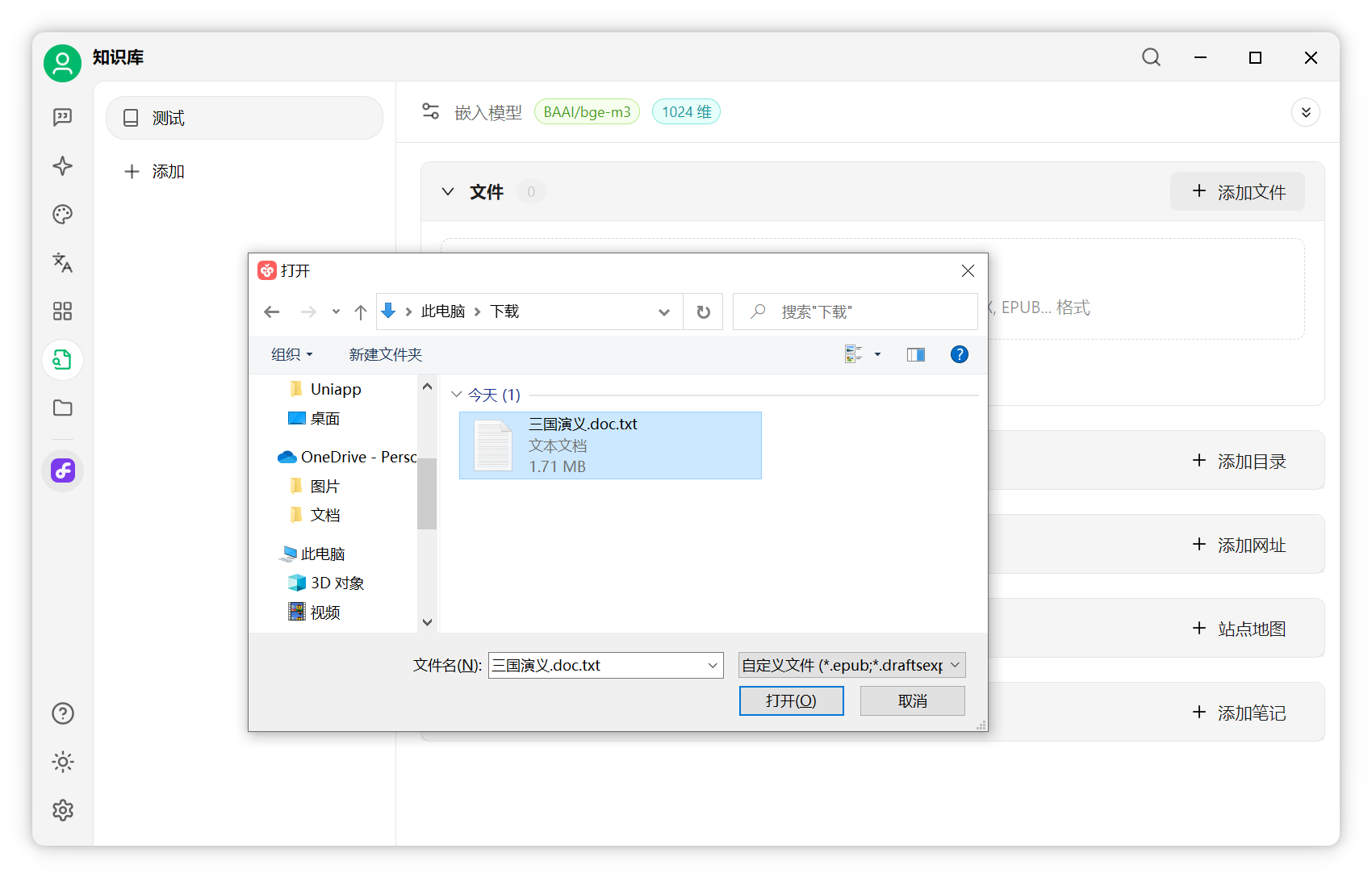 配置知识库:点击左侧"知识库"-"添加",填写名称,选择刚添加的嵌入模型,点击确定。