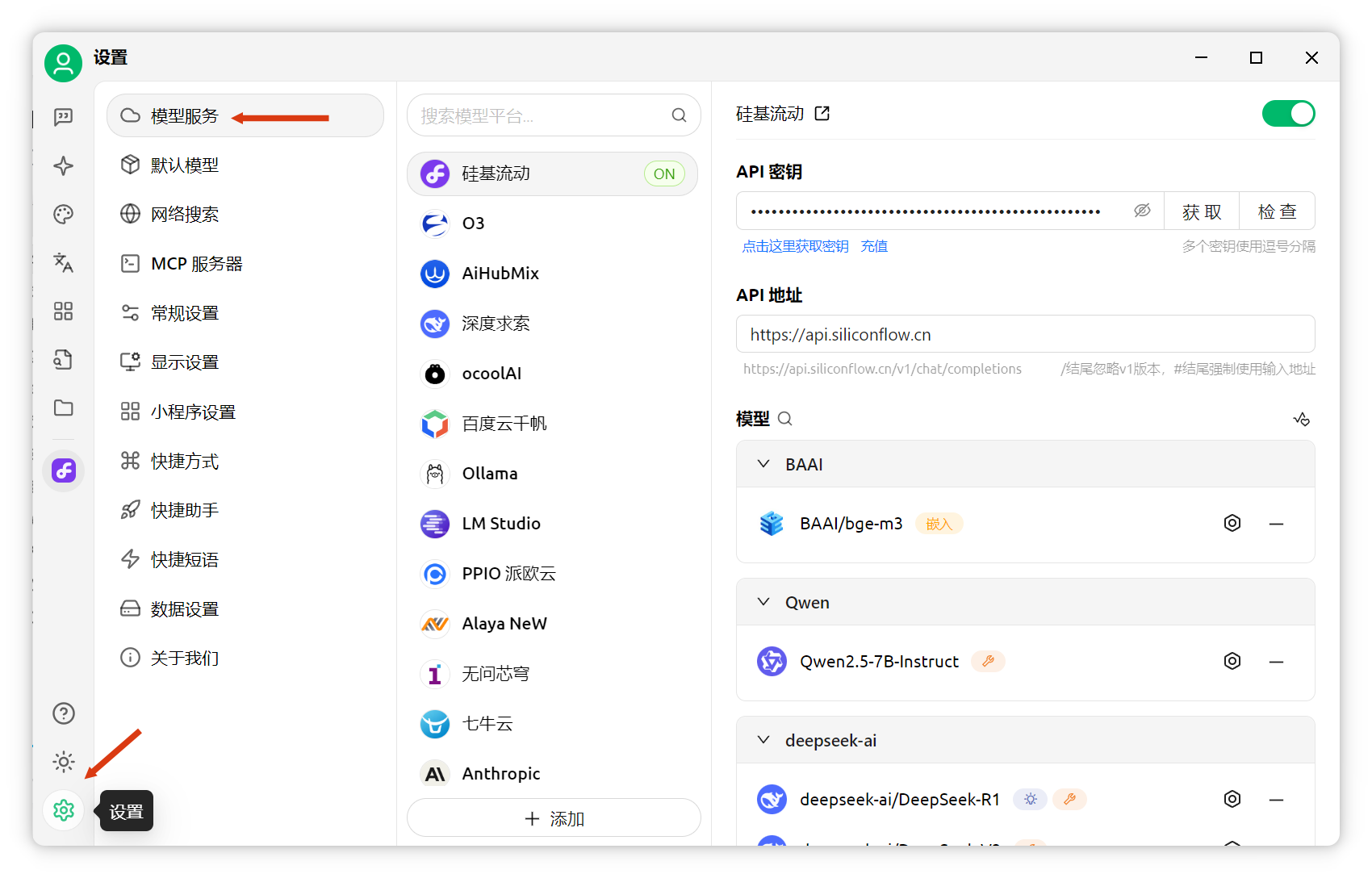 安装后,打开软件,点击左下角"设置"-"模型服务"。