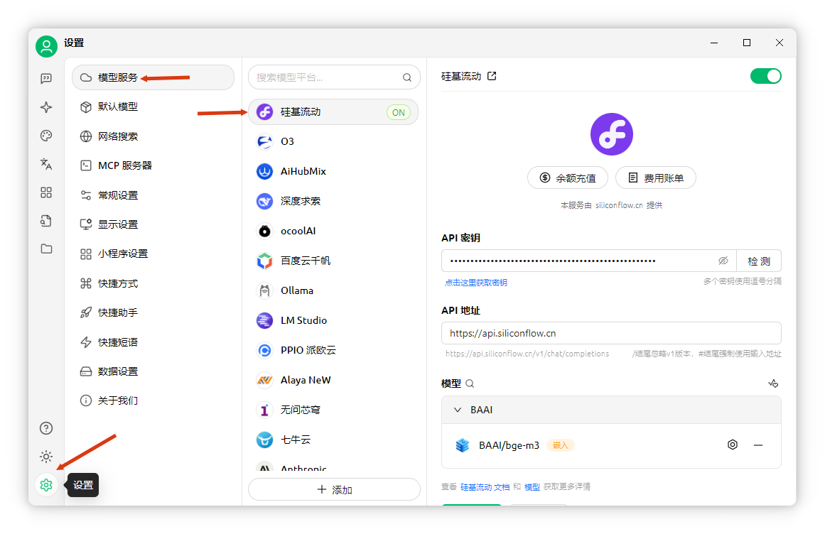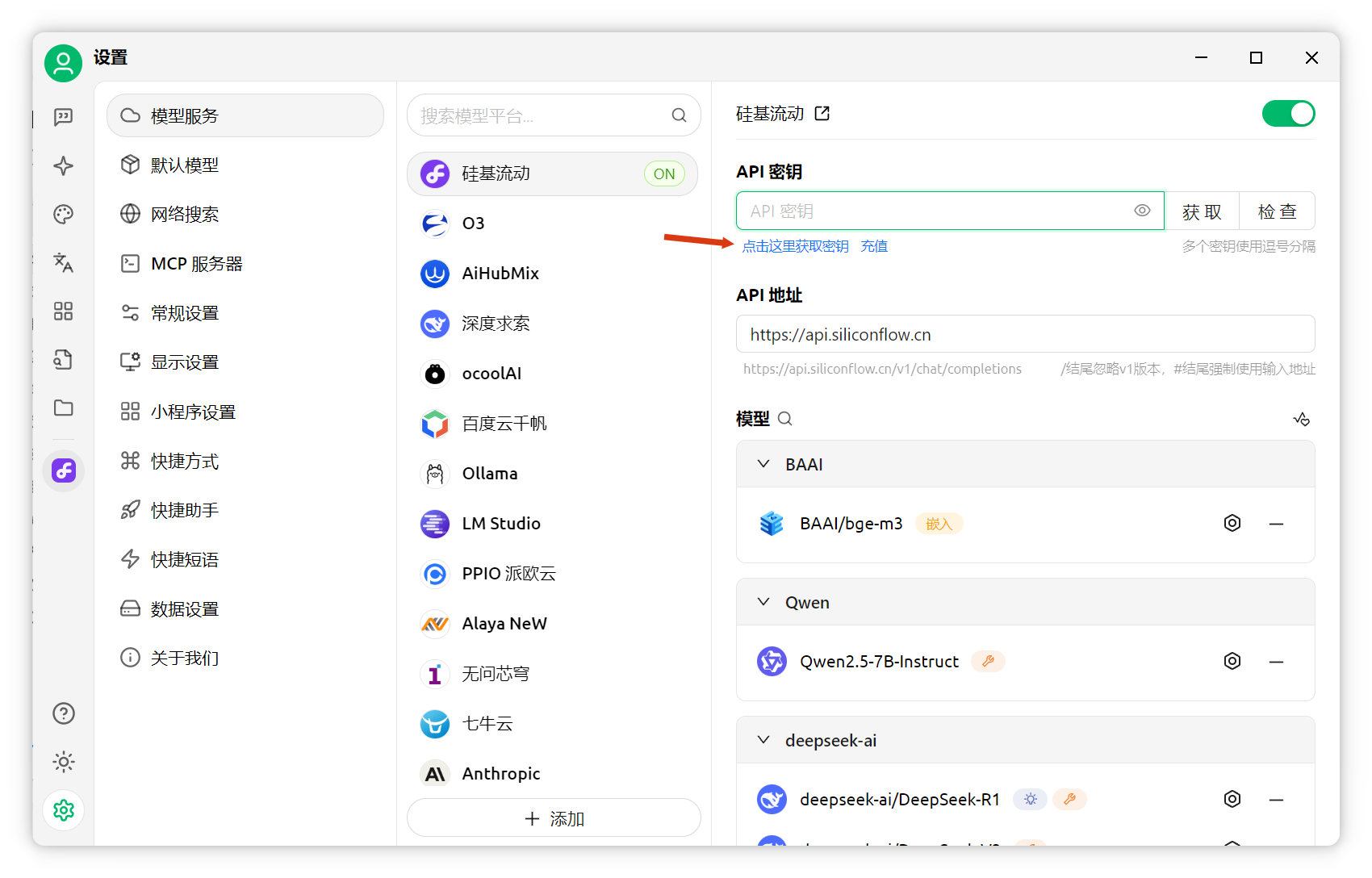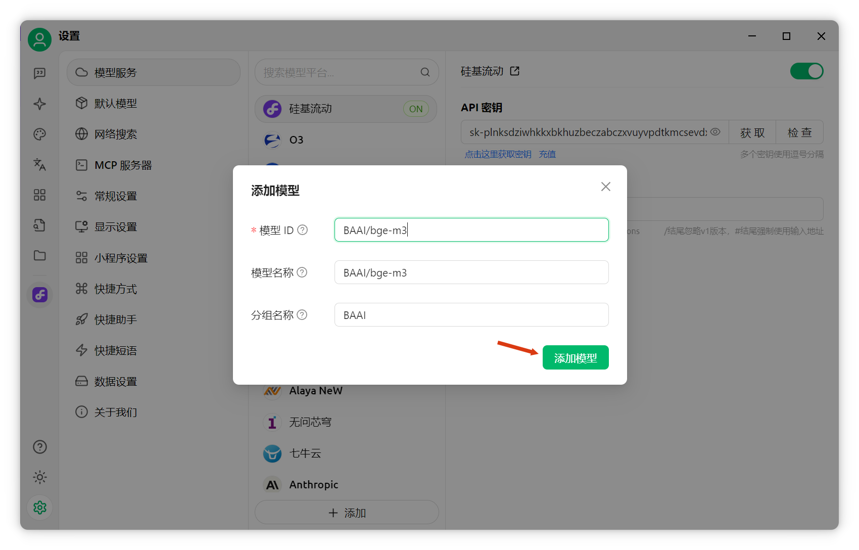 本文以硅基流动提供的免费嵌入模型为例。找到"硅基流动",点击获取密钥。若无账号可先注册。