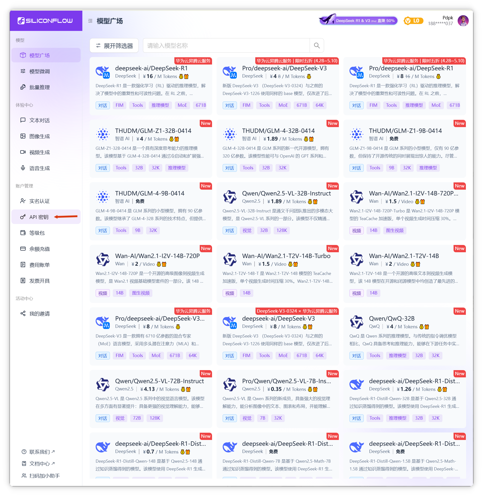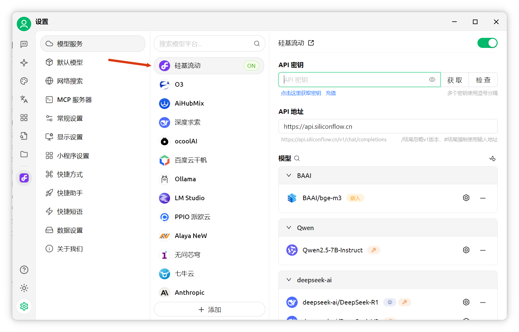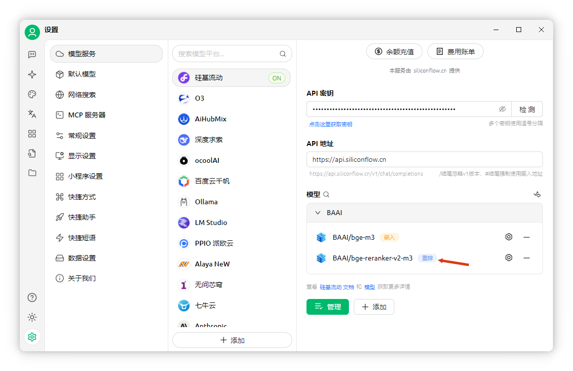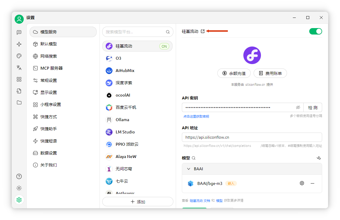 本文以硅基流动提供的免费嵌入模型为例。找到"硅基流动",点击获取密钥。若无账号可先注册。