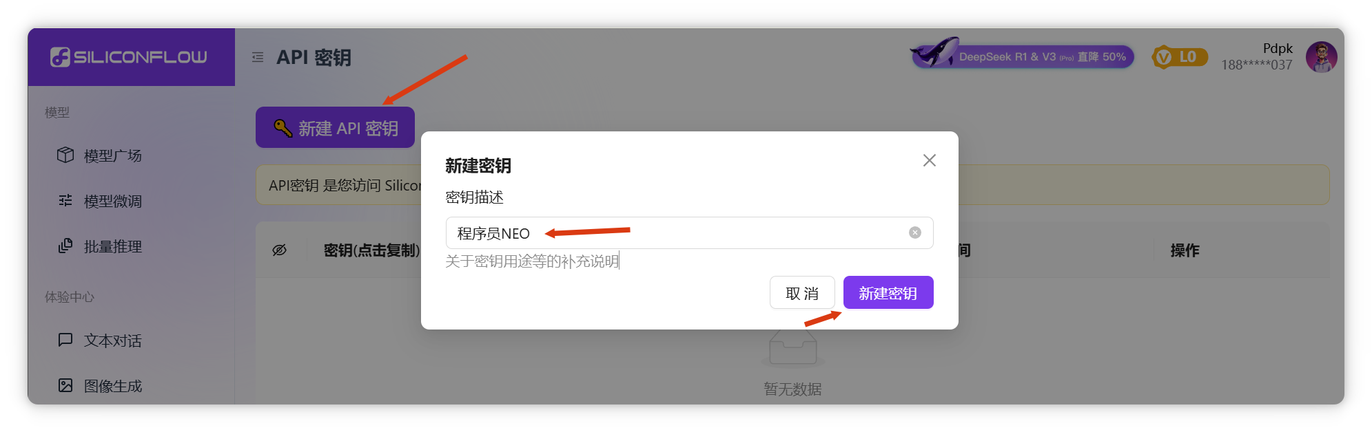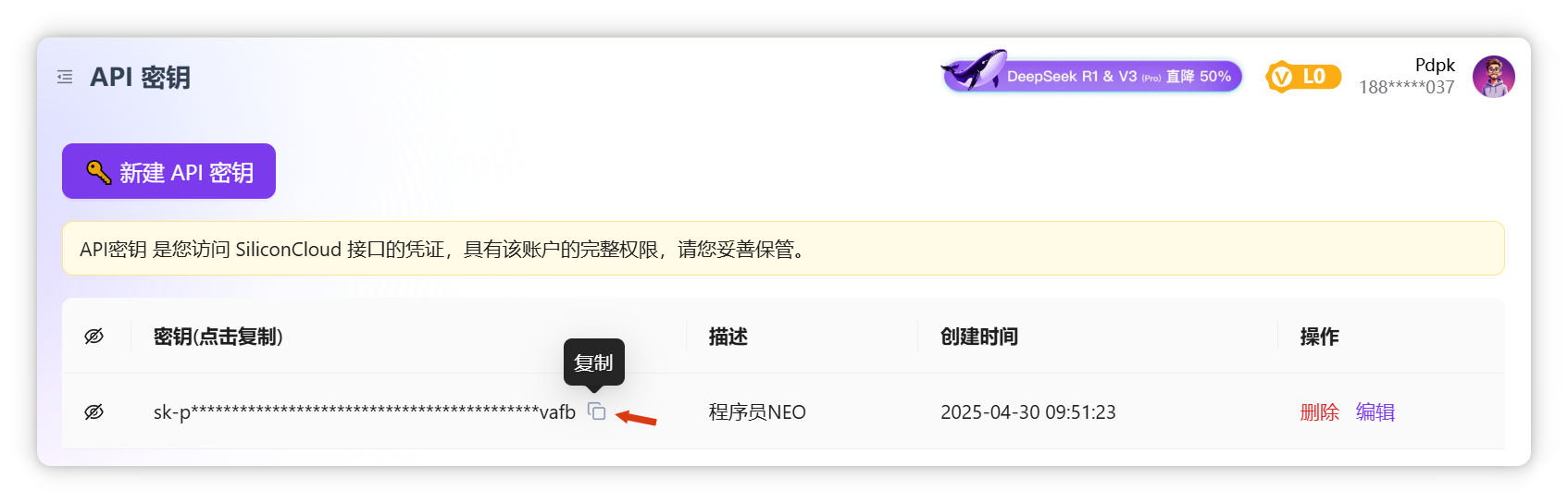 点击左侧"API密钥",新建密钥(如"程序员NEO"),复制生成的密钥。