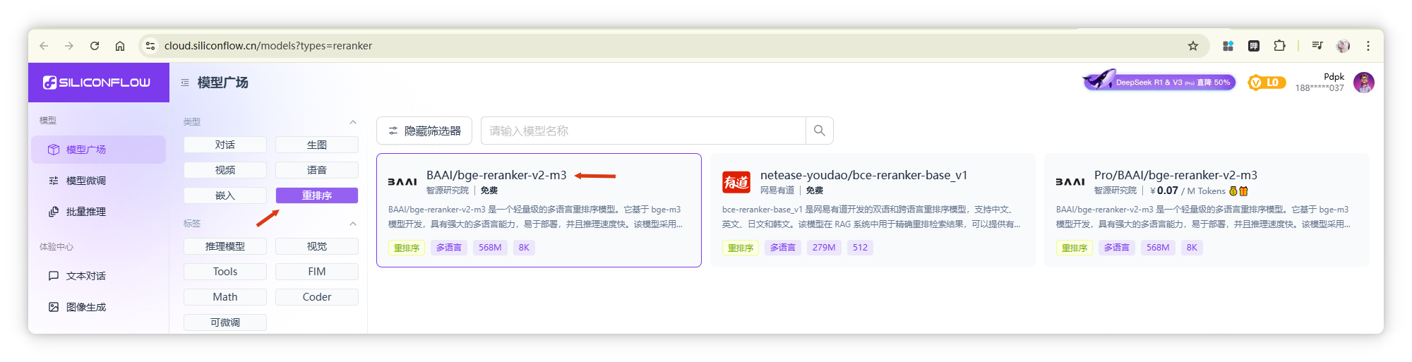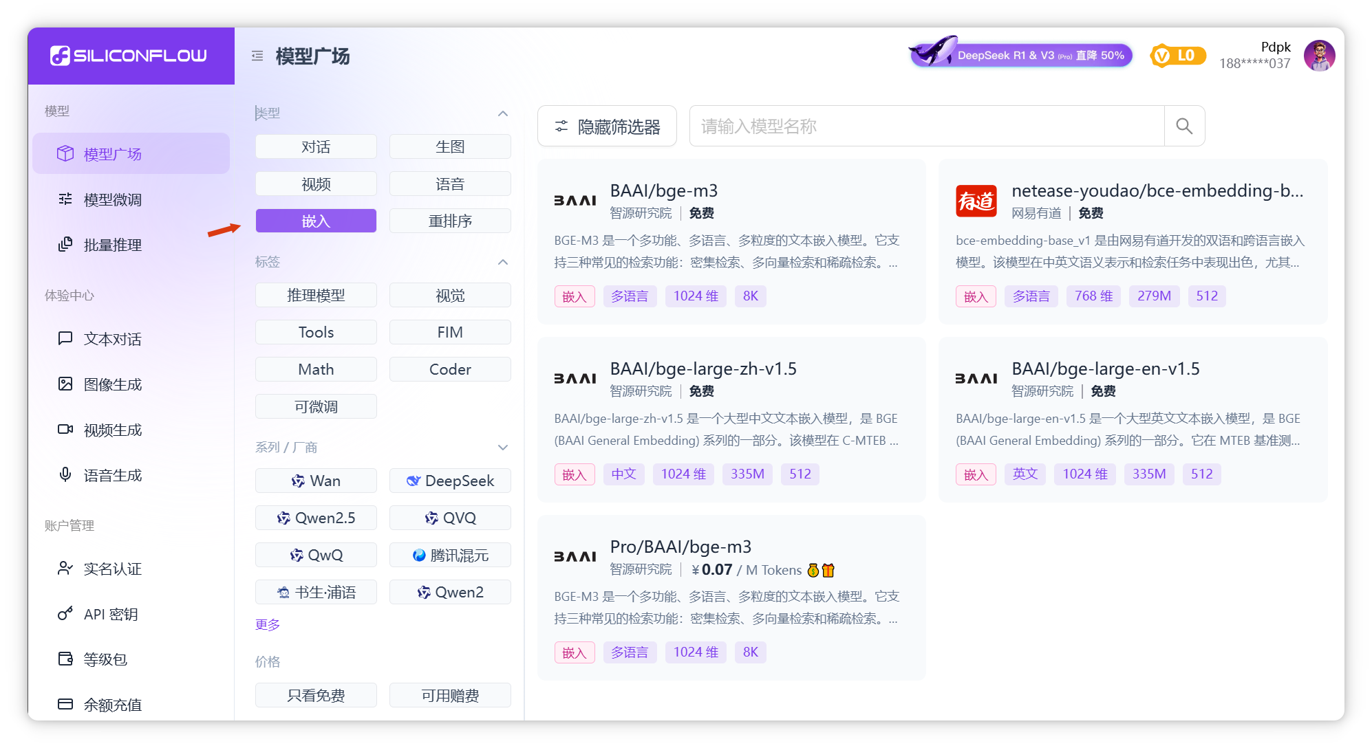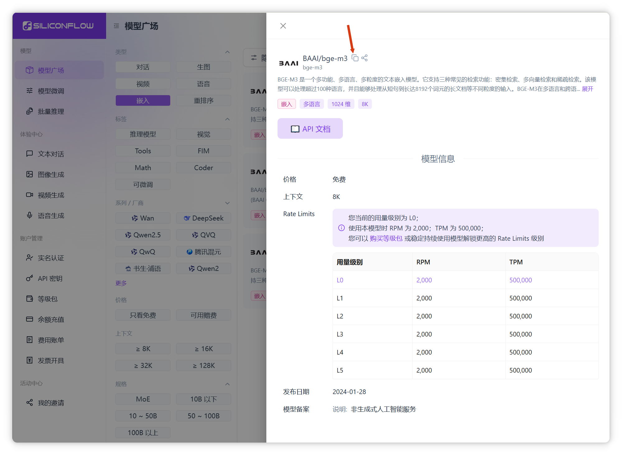 回到硅基流动"模型广场",筛选"类型"为"嵌入",选择"bge-m3(免费)",复制模型名称。