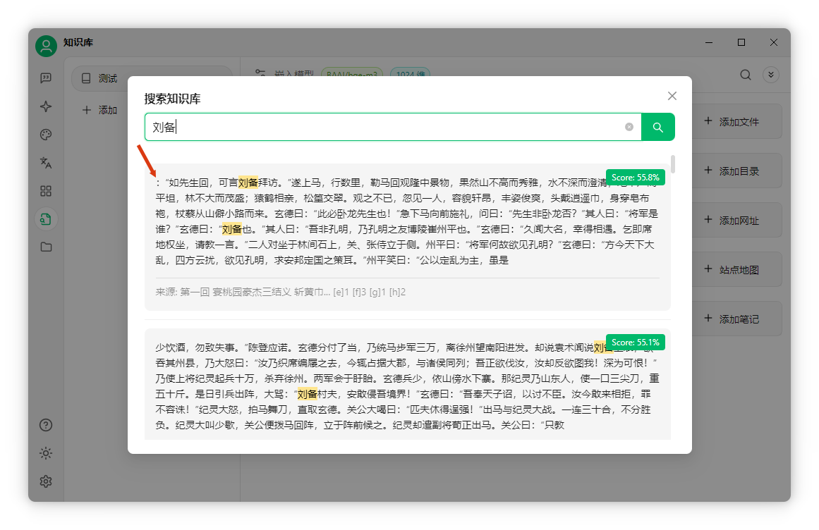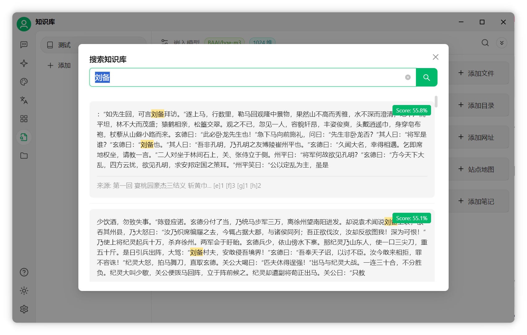 如搜索"刘备",系统会基于向量匹配查找相关段落,每段约300字。
