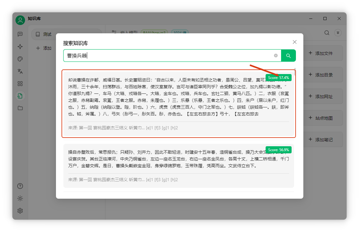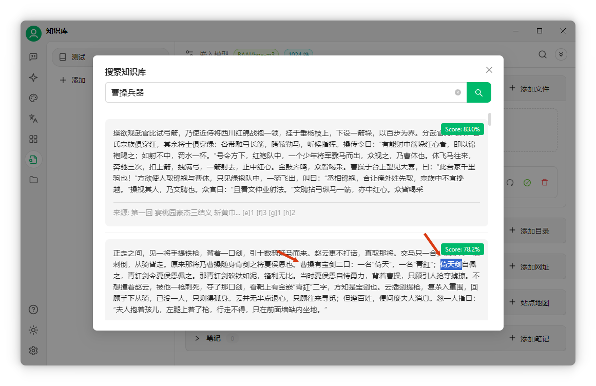 再次搜索"曹操兵器",倚天剑信息排到第二位,分数78%。重排序模型显著提升了检索精度。