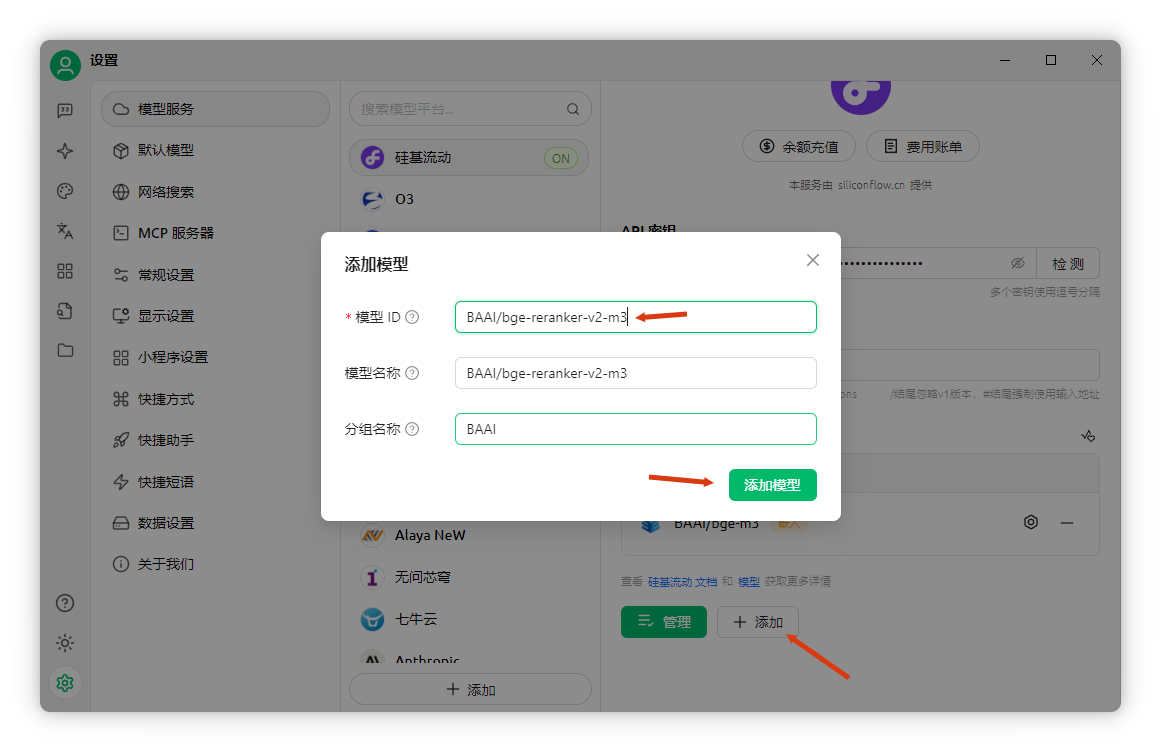 以"曹操兵器"为例,添加重排序模型后,效果明显提升。进入模型服务,找到硅基流动,添加重排序模型。