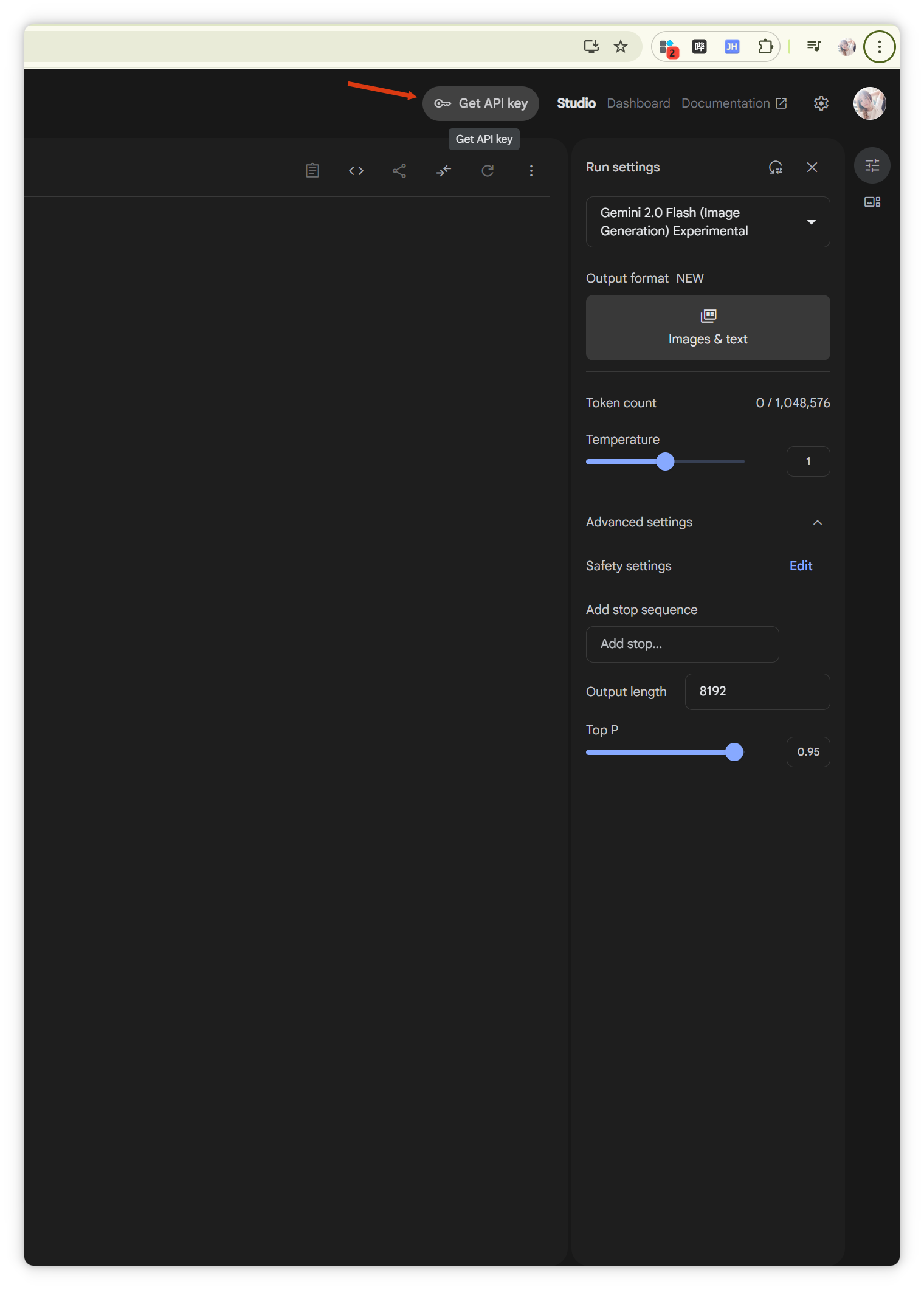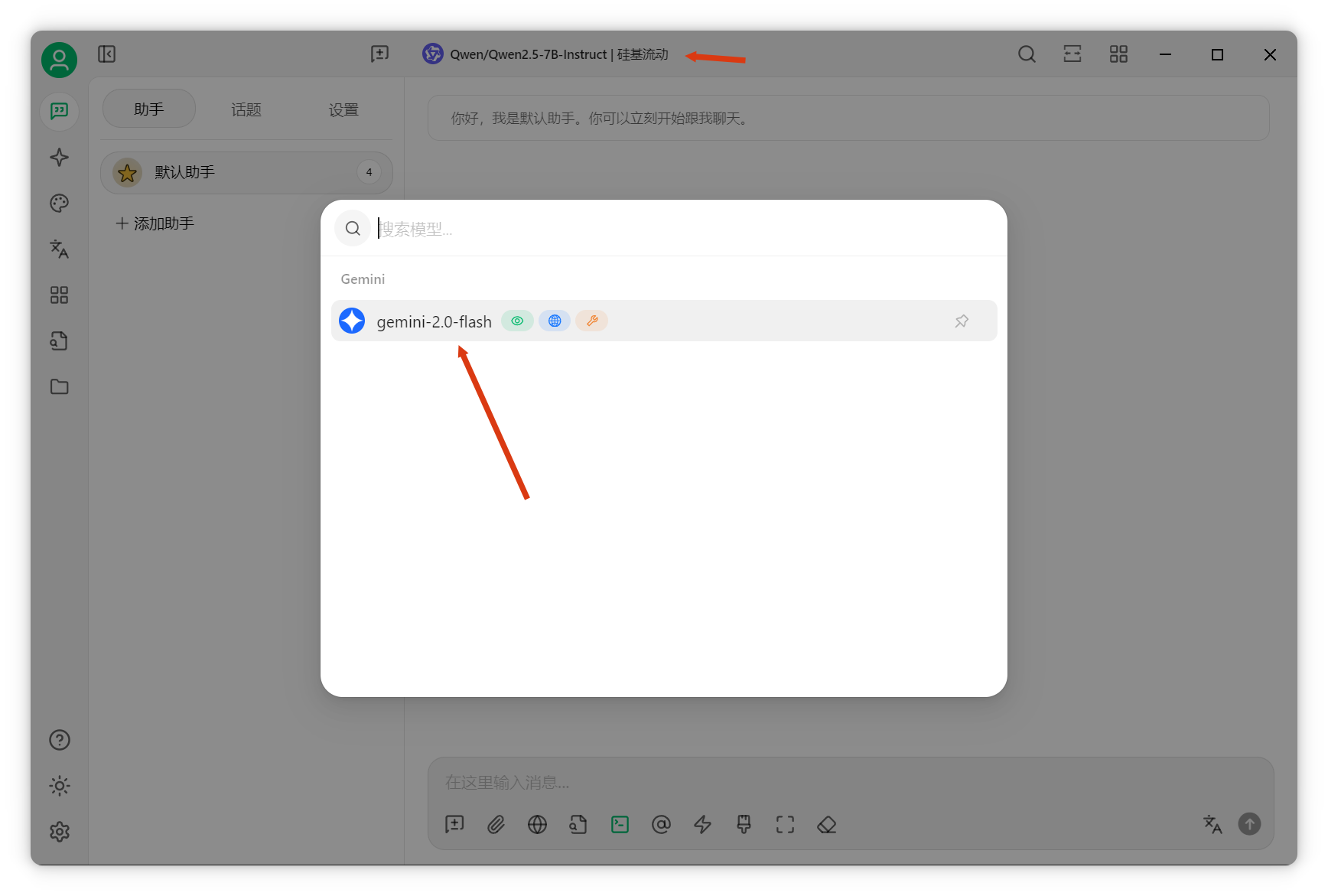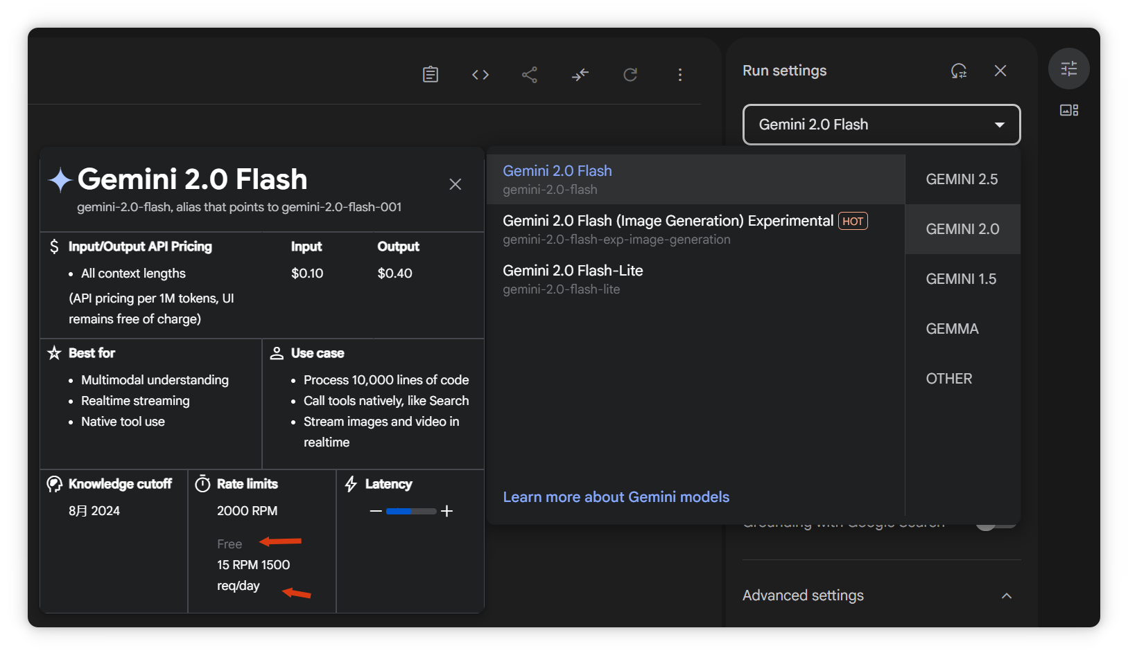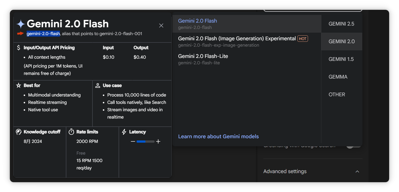 添加模型,点击"添加",模型ID可在AI Studio选择。以Gemini 2.0 Flash为例,支持100万token上下文,且有免费额度。