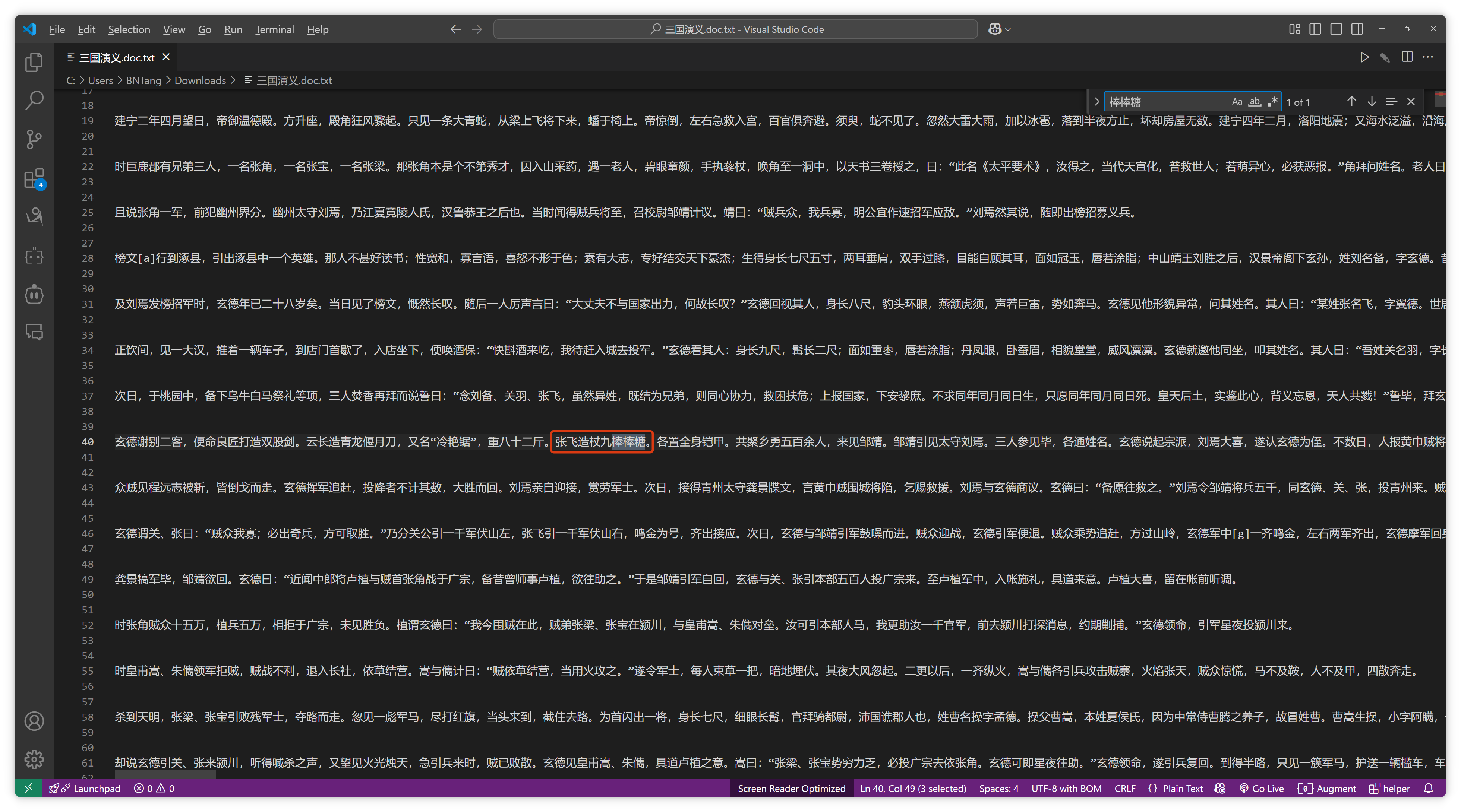 测试知识库能力。以全本《三国演义》为例,用VSCode将张飞武器改为"丈九棒棒糖",保存。