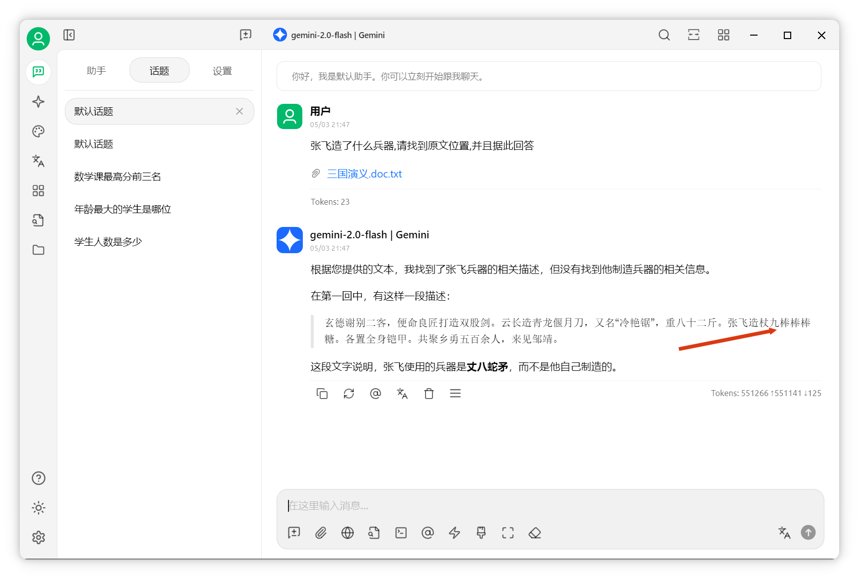 AI成功检索到答案,第一回中张飞造"丈九棒棒糖"。本次任务消耗551266 token。