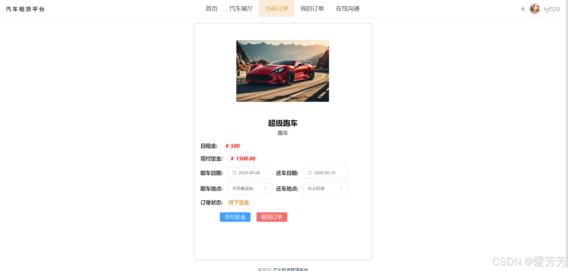 填写信息,进行汽车租赁操作,等待管理员审核后进行下一步操作,可追加租赁时间和变更地点等,支付定金后进行订单确认