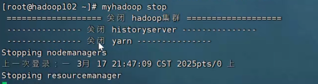 root@hadoop101 \~\]$ chmod +x /root/bin/myhadoop 像下图这样查看显示绿色即代表成功!  ##### 3.分发脚本 \[root@hadoop101 \~\]$ xsync /root/bin/  ##### 4.测试执行 分配完成后可在其他设备上关闭myhadoop  启动命令:\[root@hadoop100 sbin\]# myhadoop start 关闭命令:\[root@hadoop100 sbin\]# myhadoop stop