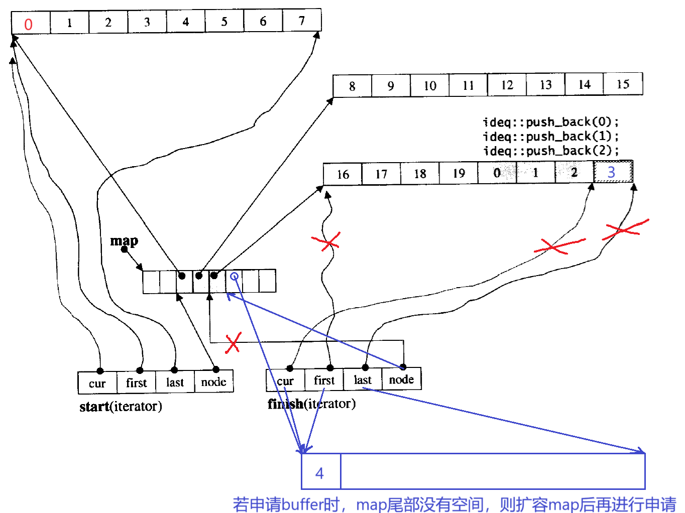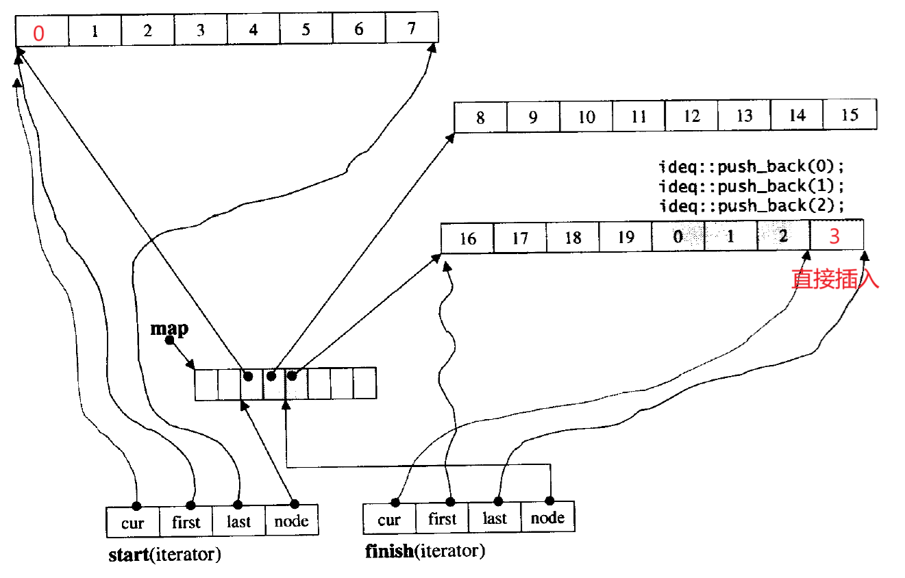 deque的start(iterator)用来控制中控数组中所指向的第一个buffer,finish(iterator) 用来控制中控数组中所指向的最后一个buffer。