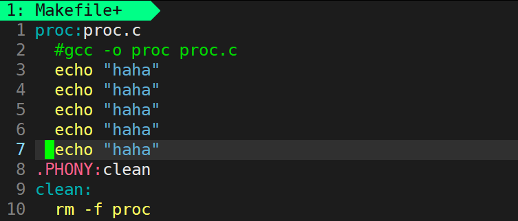 依赖关系下面缩进的部分就是依赖方法,表示执行依赖关系时执行的方法/指令,它必须以一个tab开头。gcc -o proc proc.c 和 rm -f proc 都是依赖方法。一个依赖关系下面可以有多行依赖方法,但都要以一个tab开头。依赖方法可以是任意指令。如图: