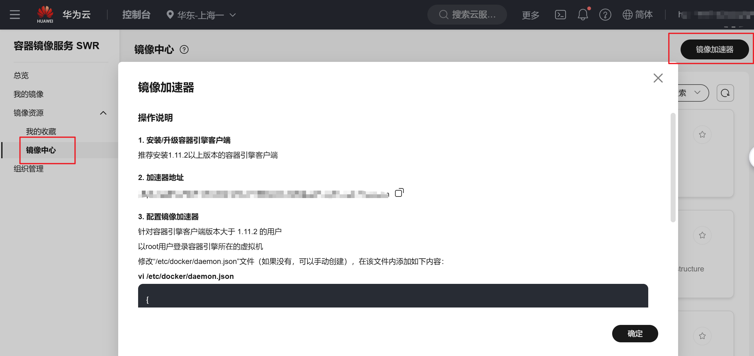 - 导航至镜像资源 > 镜像中心 > 镜像加速器 ,复制专属加速地址(格式为