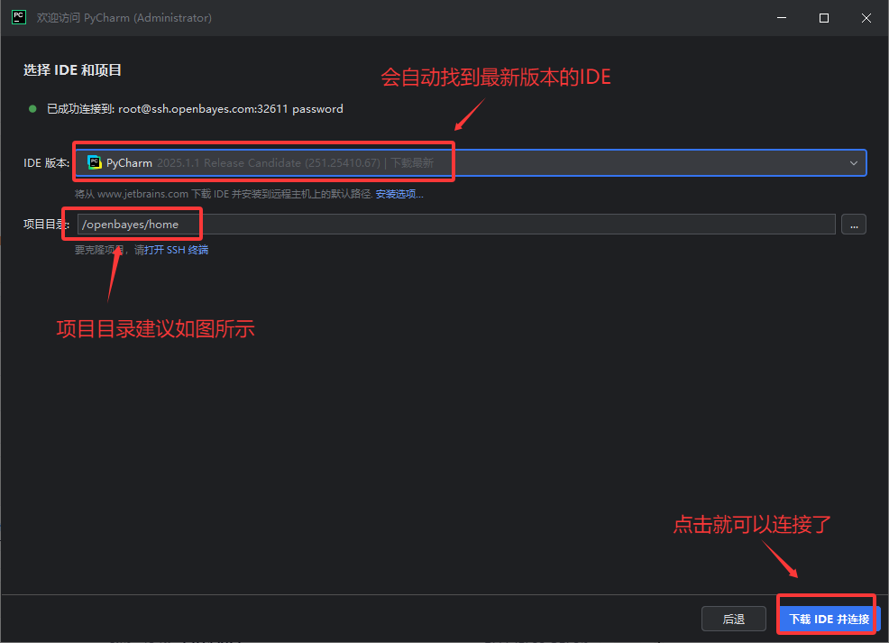 耐心等待下载IDE到远程主机后就可以连接上去了