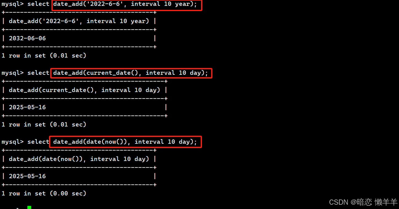 date_add:在date日期的基础上加 日期或者时间,interval 后面的加数的单位可以是 day/minute/second/year