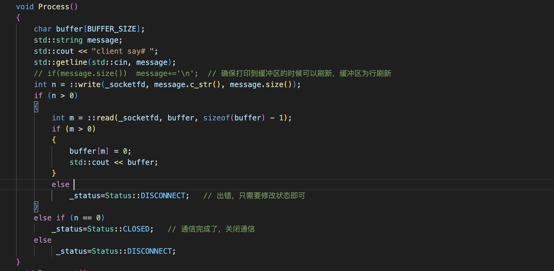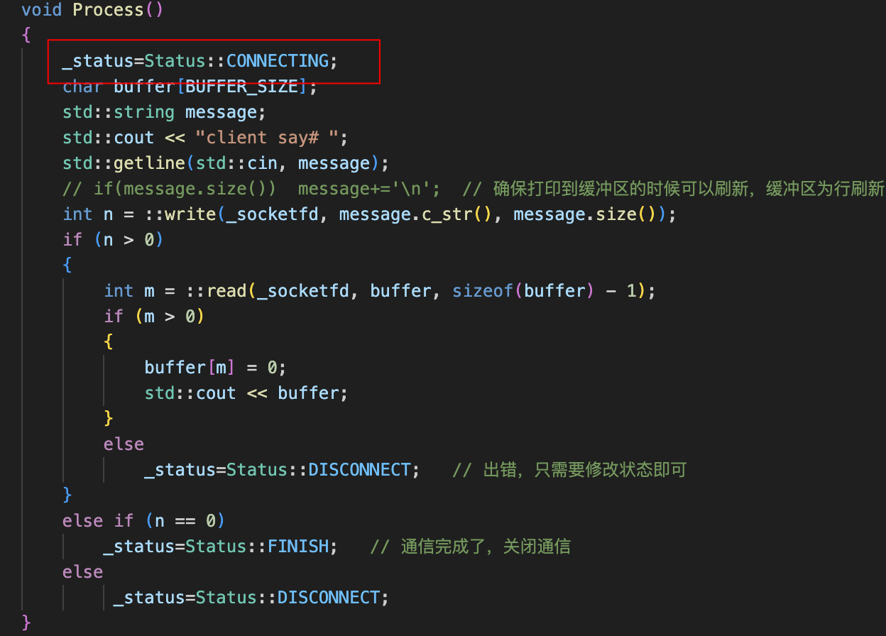 这是因为,我们服务器与客户端之间的通信循环走的是外面的这个状态判断,当状态为CONNECTED的时候,我们正常执行process代码,但当第二次循环的时候,由于我们连接状态一直是成功的,所以再执行这里的时候,还是会打印这条信息,那我们应该怎么办呢?