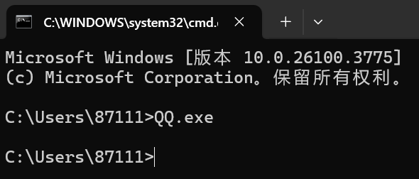 重新打开命令提示符窗口,输入QQ.exe就也可以运行QQ了。