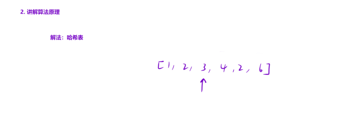 这个题思路跟上一个题的思路有点像,使用哈希表,从前往后遍历,从1开始遍历,判断哈希表中时候有此时的值,没有的话,把现在的值插入哈希表中,然后遍历下一个位置。