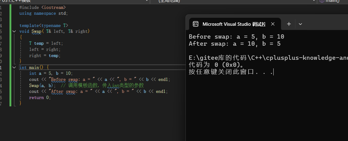 Swap(a, b); // 调用模板函数,传入int类型的参数