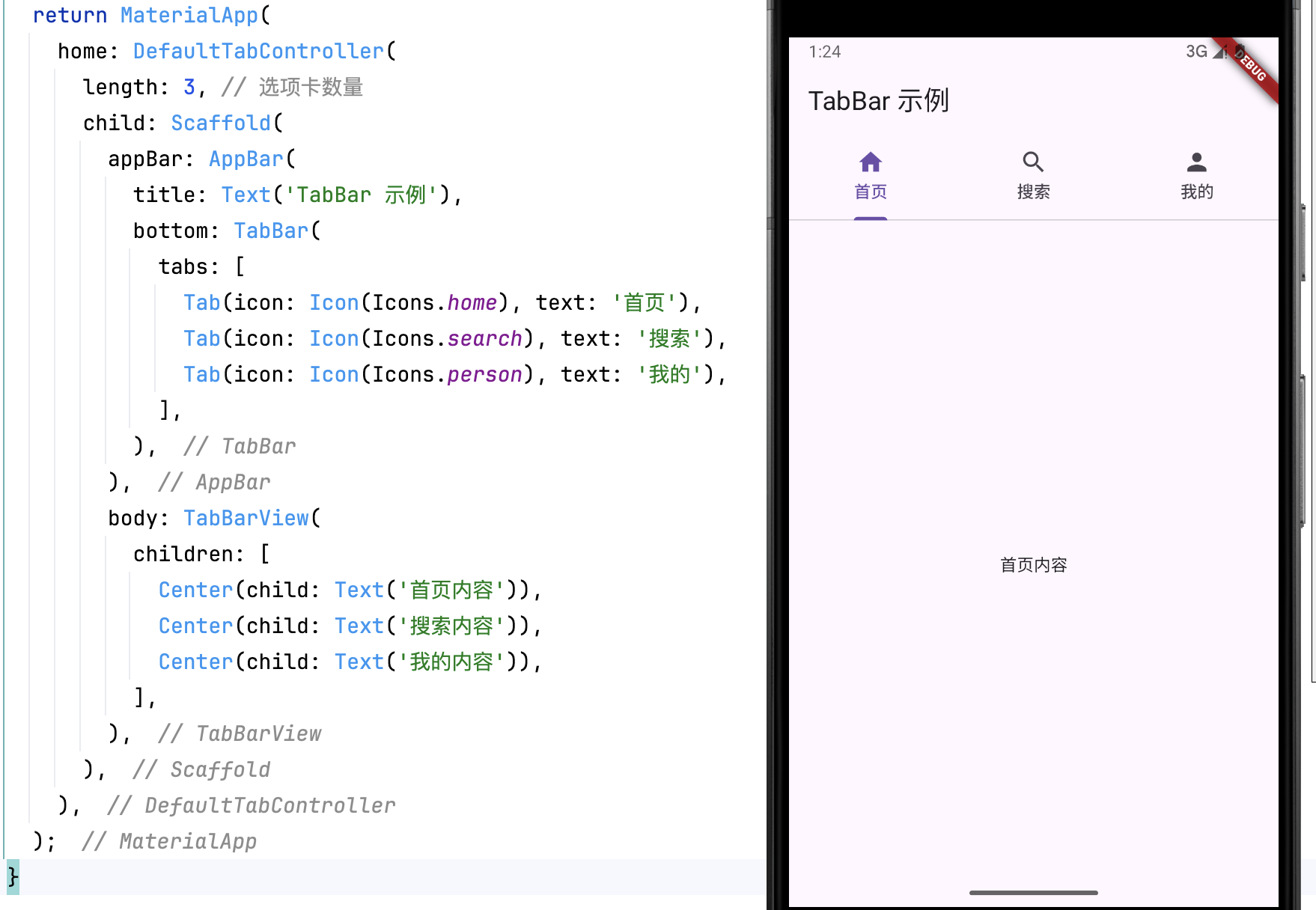 DefaultTabController(length: 3, child: ...):定义标签页的数量。TabBar:定义标签,支持文本和图标。TabBarView:对应的内容页,顺序与TabBar一致。Scaffold.appBar:包含TabBar,用于展示选项卡。
