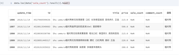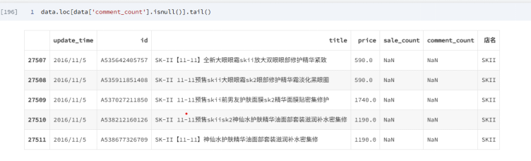 通过上面观察数据发现sale_count,comment_count 存在缺失值,先观察存在缺失值的行的基本情况