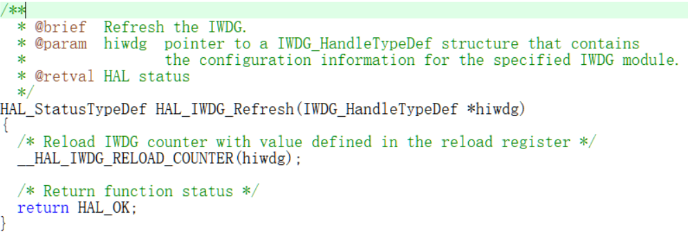 - HAL_StatusTypeDef HAL_IWDG_Refresh(IWDG_HandleTypeDef *hiwdg)