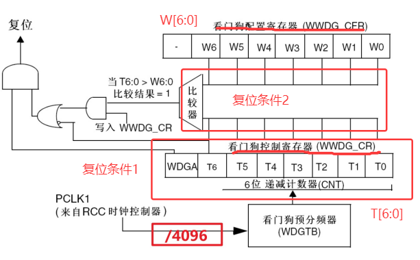 - 窗口看门狗的本质是一个能产生系统复位信号 和提前唤醒中断的 6位计数器。