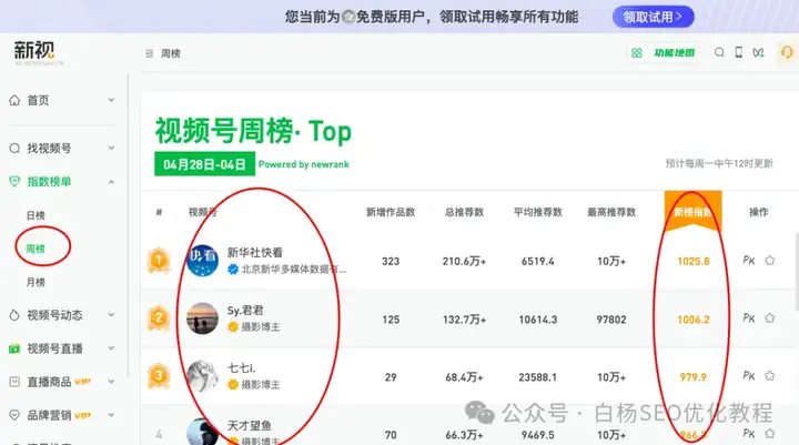 3、新榜工具:可查询微信公众号等平台的热文排行和热度趋势,有免费的榜单等基础数据,能了解热门话题在微信平台的传播情况和热度排行,使用如图。