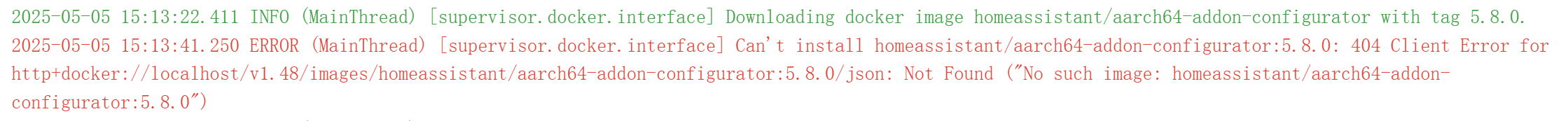 在网上查了很多资料,没有一个完美解决方案。通过分析错误日志发现是下载docker镜像 homeassistant/aarch64-addon-configurator时出错。