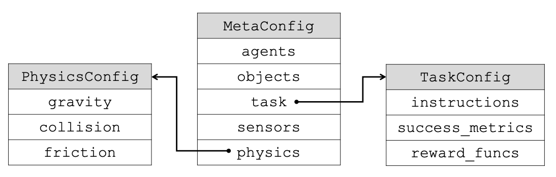 基于这一原则,设计一个配置系统 MetaConfig,以与模拟器无关的方式抽象模拟场景。如图所示,MetaConfig 是一个嵌套类,包含上述核心组件。它可以被不同的模拟器后端解释,从而构建相应的模拟。此外,MetaConfig 支持可选的模拟器特定超参数(例如,求解器类型),从而允许通过定制充分利用不同模拟器的独特功能。