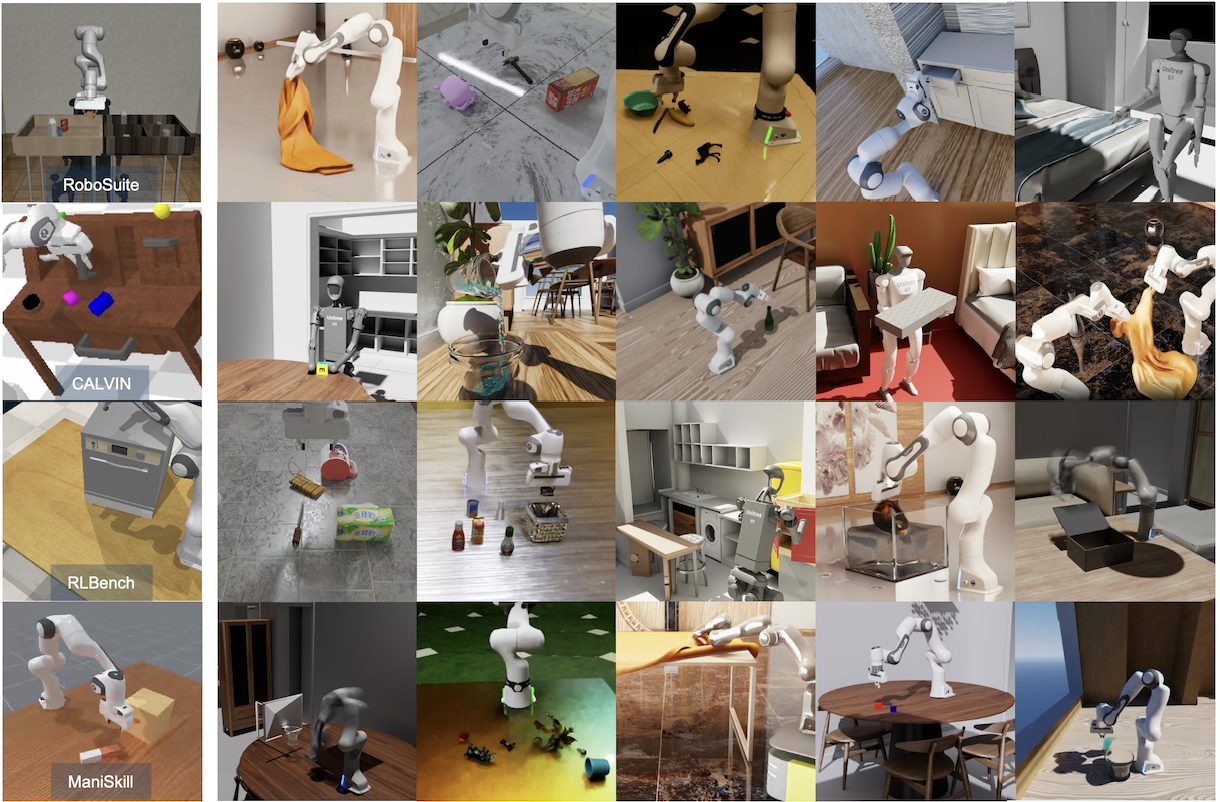 基准测试仍然是机器人领域一个关键且极具挑战性的问题。与监督学习任务相比,评估机器人模型的性能相对困难。Meta-World [134] 是多任务基准测试的早期尝试。紧随其后的是 RLBench [48]、BEHAVIOR-1K [63]、Habitat [111] 和 ManiSkill [84, 37, 112, 107],涵盖了各种各样的机器人任务。Grutopia [120] 和 InfiniteWorld [100] 向通用机器人基准测试迈出了一步。尽管研究人员为这些基准测试付出了巨大的努力,但并不能保证结果在不同的基准测试中具有可重复性。不确定性来自多个方面,包括模拟精度、渲染风格和资产属性 [66, 26]。