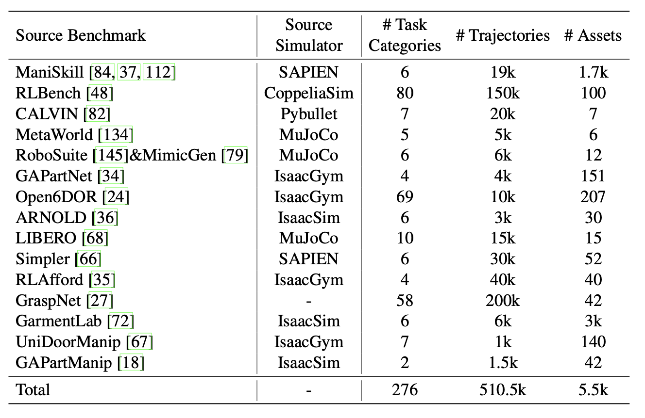 a) 操作数据集:将现有源基准 [84, 37, 112, 48, 82, 134, 145, 79, 34, 24, 36, 68, 66, 35, 27, 72, 67, 18] 中的各种操作数据集迁移到 ROBOVERSE。下表汇总了各源基准贡献的任务类别、轨迹和资产数量。本次迁移共计生成 276 个任务类别、510.5 万条轨迹和 5.5 万项资产。