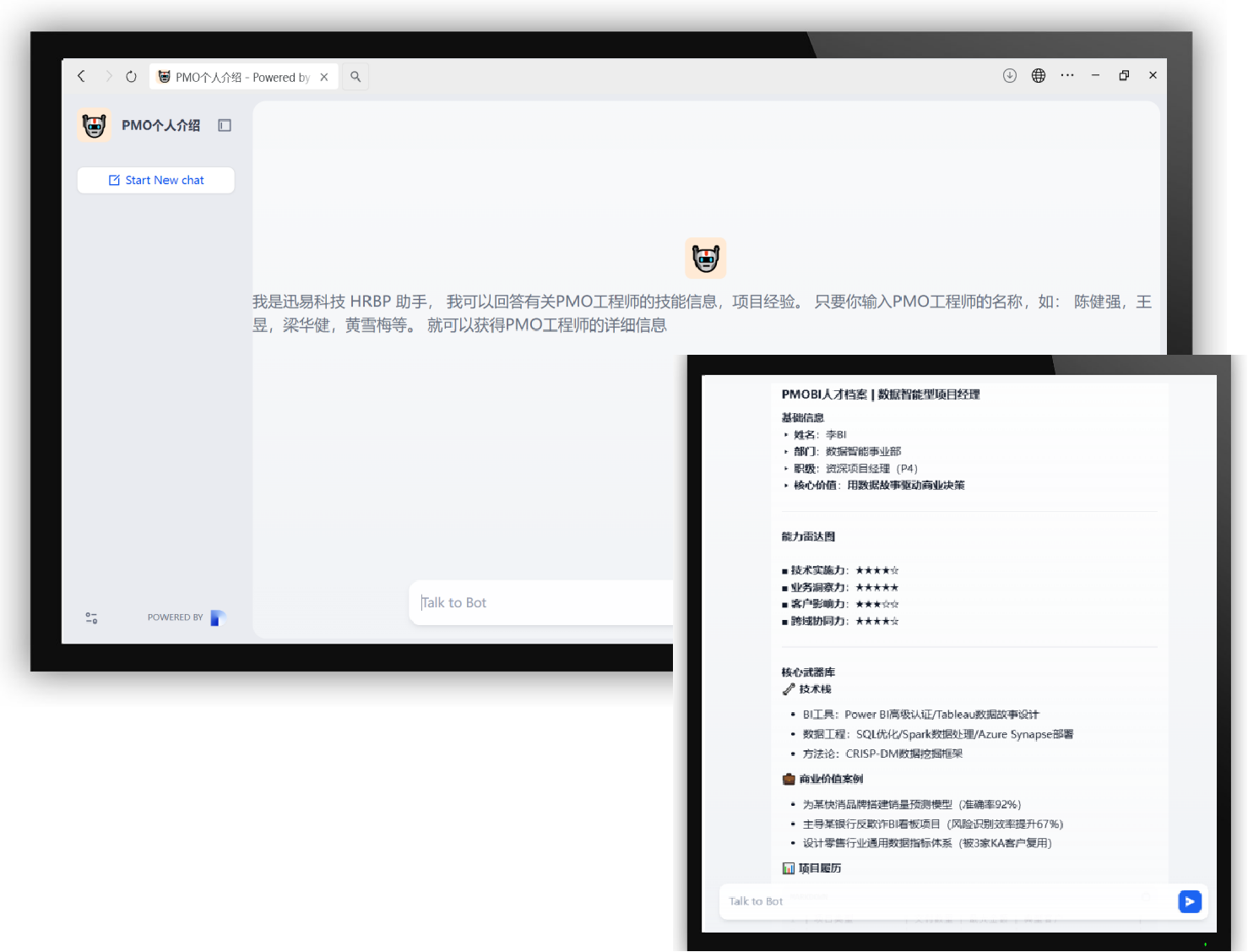 **亮点优势:**销售部门输入客户需求文档或邮件片段,知识库可以自动抽取技术要点,结合项目库中匹配的SOW文档,关联具备"报表开发+甲方沟通经验"的工程师。对比传统流程,人才筛选效率提升90%。