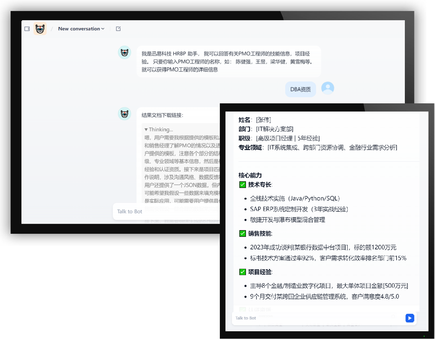 - **语义级搜索:**理解不同技术的复杂需求,秒级内匹配兼具技术契合度与时间可用性的人选,错配率降低67%。