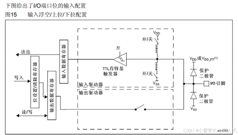 | 输入 | 下拉输入 | 当外部没有上下拉时,如果外部有效信号是高电平,选择下拉输入。 特点:在没有信号输入时,可以把IO钳在低电平 |