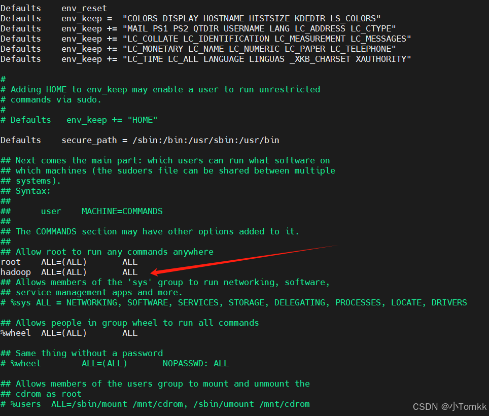 hadoop ALL=(ALL) NOPASSWD: ALL