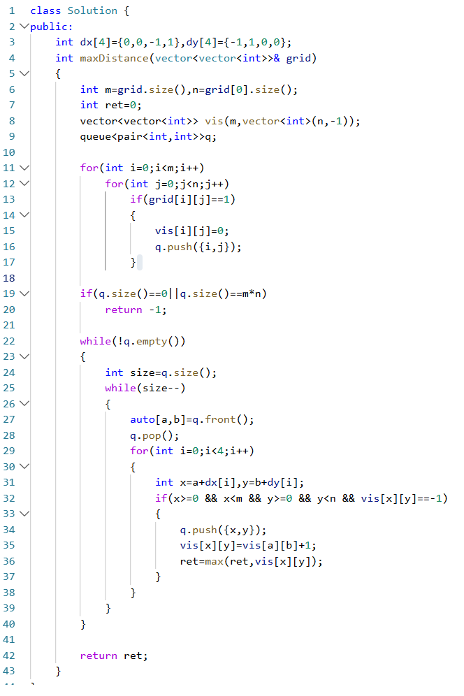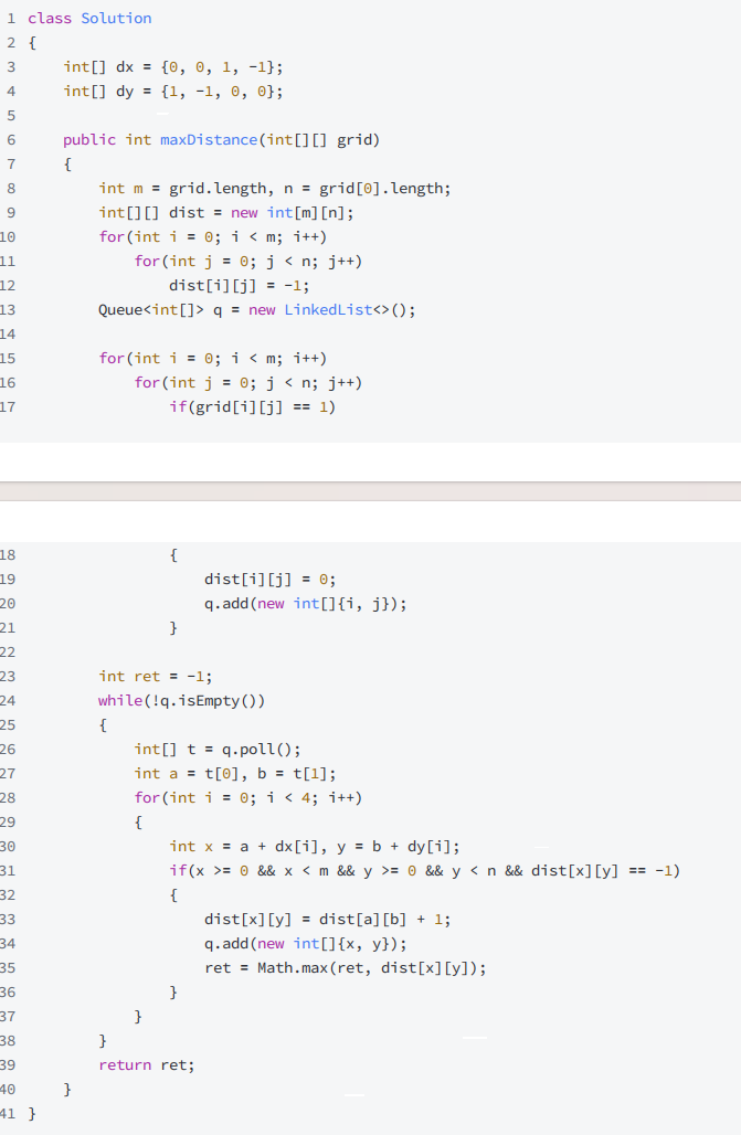 其实很简单,我们可以先把所有的 0 都放在队列中,把它们当成⼀个整体,每次把当前队列里面的所有元素向外扩展⼀次。