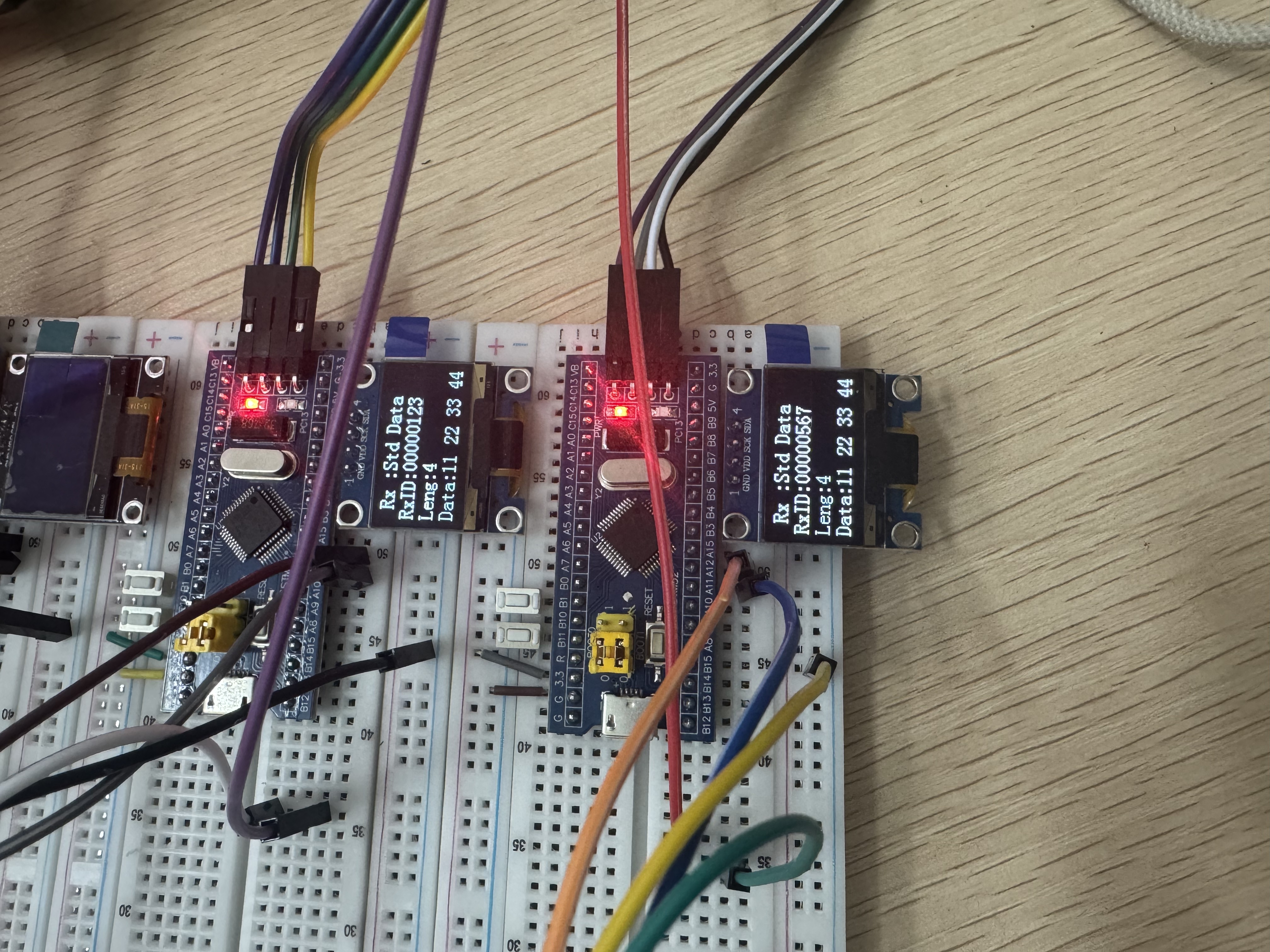 首先接收方按键按下,比如按下按键1,则接收方发出一个0x300的遥控帧MyCAN_Transmit,然后这个数据会到发送方这里来,发送方接收帧MyCAN_Receive,判断收到0x300的遥控帧了,就置RequestFlag = 1,然后继续运行代码,发送方发出TxMsg_Request也就是0x300的数据帧,最后返回接收方,接收方执行接收部分代码,判断,收到0x300的数据帧后,显示出来
