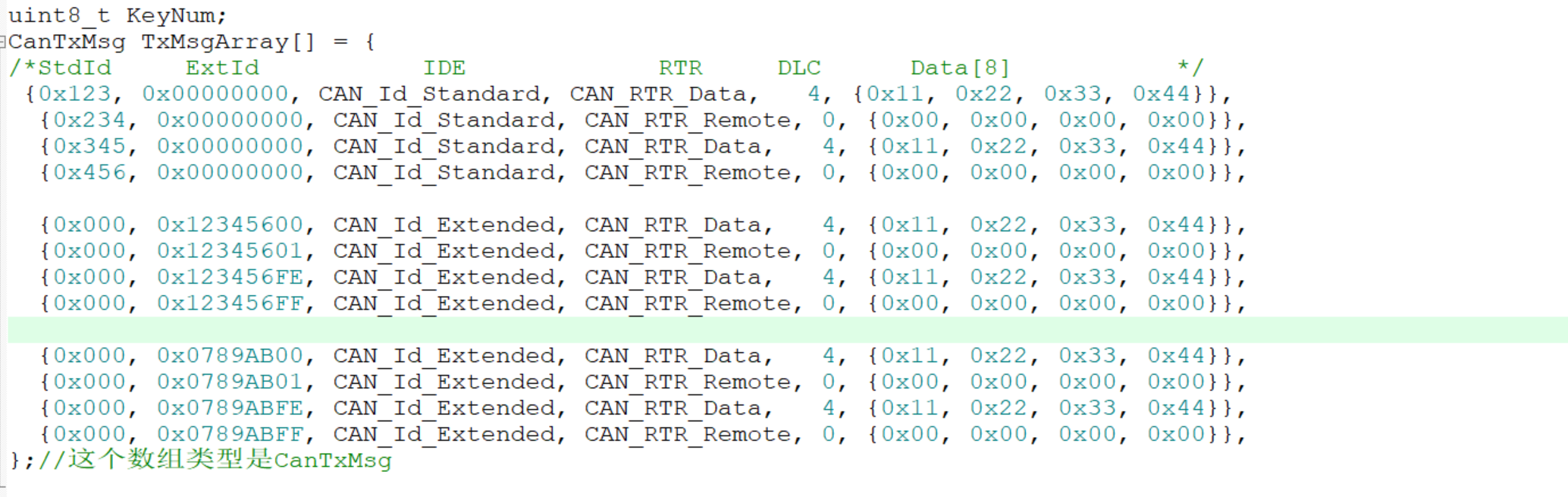 CanTxMsg TxMsg_Trigger = {//触发发送结构体