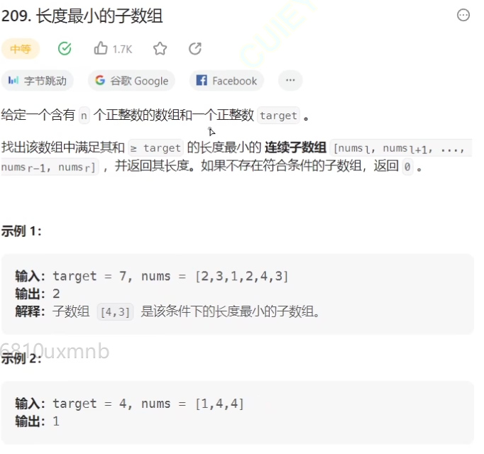 两个指针的移动规则时,只要sum<target,我就让right++直到求和≥target。当发生此情况时,让left++然后重新计算二者之间的和(求和的方法我们可以用上一次的和-nums[left-1]。二者之间的区域我们就可以看成窗口在之间滑动,left每移动一次(符合条件的子数组),就记录一下当前的窗口长度。然后比较每一次的长度取min,直到right走到结尾。