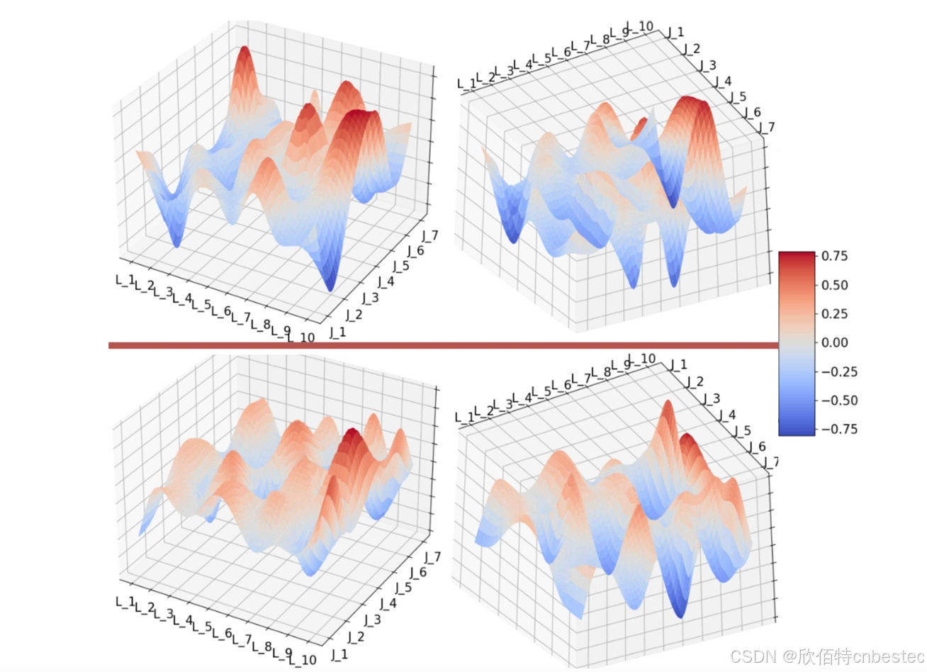 图4:本图展示了基于GRU的变分自编码器(VAE)在使用(顶部)和不使用(底部)退火调度器时的训练结果。Z轴表示每个潜在特征L1到L10以及Kinova机器人关节J1到J7的相关系数分数。