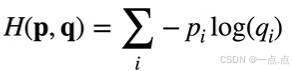 - 离散概率公式:假设有两个离散概率 p 和 q,有 n 个元素,交叉熵公式为对每个元素 i,负的 pi 乘以 log qi 然后求和。