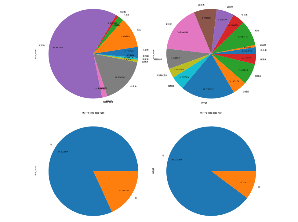 通过饼图展示男士专用产品的销售偏好,发现男士主要关注清洁和补水类产品。