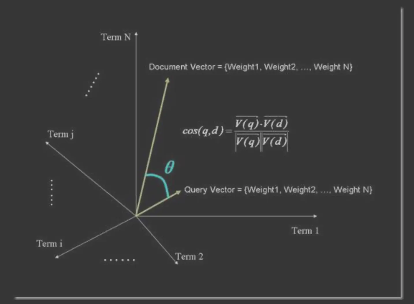 大致思路就是,将每一个文档通过计算每个词的权重,然后组成一个向量。然后用户搜索的条件也变成一个搜索的向量(因为搜索条件可能会有must,也可能有must not这种,所以会分布在坐标系的各个象限),最后对比哪个向量的夹角较小,就符合搜索条件。